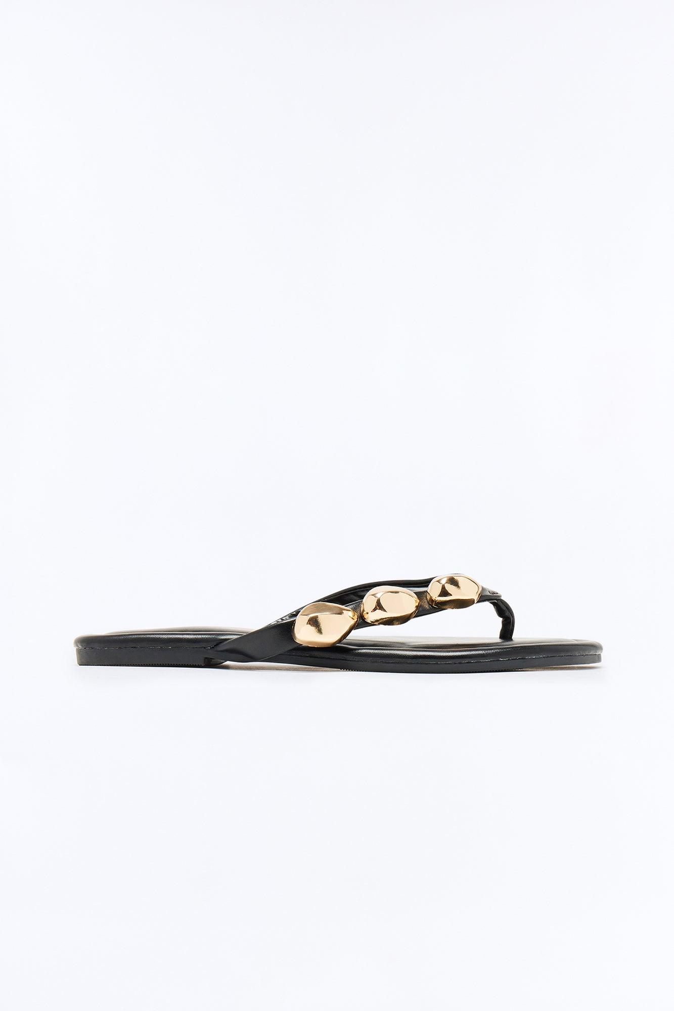 Available In Black, Silver And White. Flat Sandals Flip Flops Hardware Detail Round Toe Flat Heel Imported California Proposition 65WARNING: Cancer and Reproductive Harm - www.P65Warnings.ca.gov.
