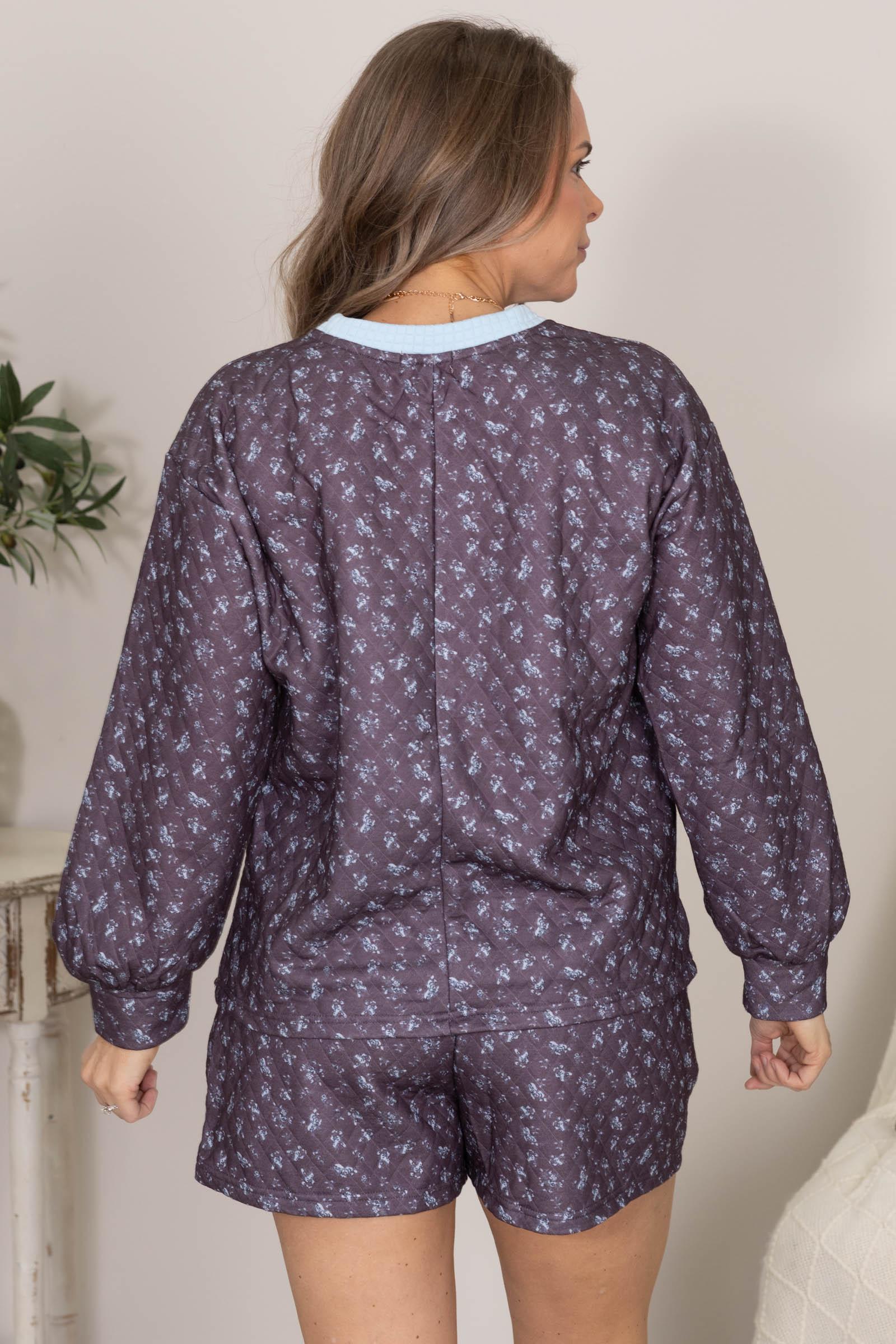 Product Details Color: Charcoal, Baby Blue Print: Floral/Quilted Neckline: Round Sleeve: Long Sleeve Hemline: Straight 2 Piece Set Brand: Anniewear Material and Care Self: 100% Polyester Contrast: 90% Polyester, 10% Spandex Hand Wash Cold Hang or Line Dry Size and Fit Top Small: Bust 42" Waist 42" Length 25" Medium: Bust 44" Waist 44" Length 25.5" Large: Bust 46" Waist 46" Length 26" X Large: Bust 48" Waist 48" Length 26.5" Erica is wearing a size small Bottom Small: Waist 28" Rise 13" Inseam 3.5" Medium: Waist 30" Rise 13" Inseam 3.5" Large: Waist 32" Rise 13.5" Inseam 3.5" X Large: Waist 34" Rise 14" Inseam 3.5"