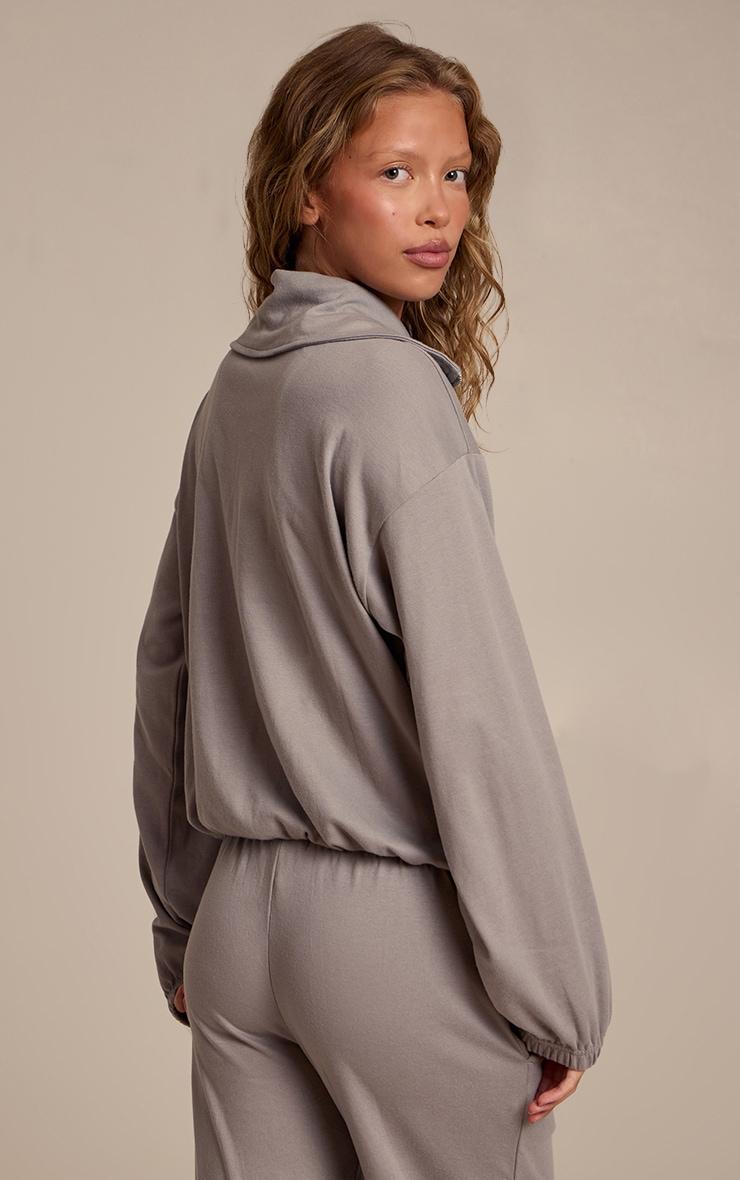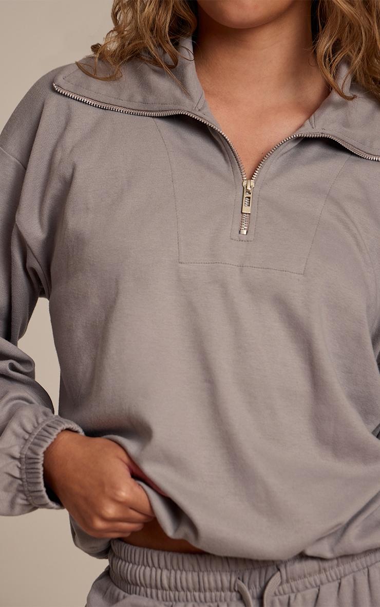 Stay casual in this charcoal grey quarter zip soft touch top. Made from a charcoal grey material with a soft touch finish and a quarter zip design. Team this top with the matching bottoms and your fave sneakers for an everyday look.Length approx 48.5cm/19inch Model wears size UK 8/ EU 36/ AUS 8/ US 4Model Height - 5ft 10inchp]:!mb-4inch>Category: AthleisureProduct type: Long Sleeve TopColor: GreyMaterial: Cotton JerseyOccasion: Day