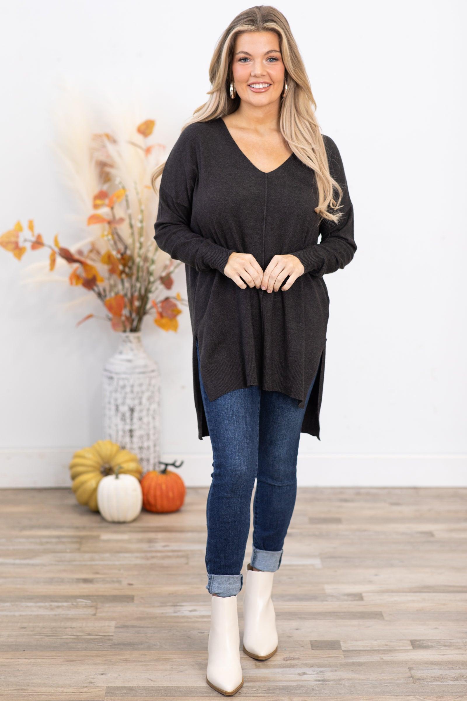 Product Details Colors: Charcoal Print: Solid Neckline: V-Neck Sleeve: Long Sleeve Hemline: Straight Hi/Lo Brand: Zenana Material and Care 50% Viscose 28% Nylon 22% Polyester Hand Wash Cold Hang/Line Dry Size and Fit X Small: Bust 48" Waist 44" Front Length 27" Back Length 29" Small: Bust 50" Waist 46" Front Length 27.5" Back Length 29.5" Medium: Bust 52" Waist 48" Front Length 28" Back Length 30" Large: Bust 54" Waist 50" Front Length 28.5" Back Length 30.5" X Large: Bust 56" Waist 52" Front Length 29" Back Length 31" Photo model is 5'4 and wearing a size small