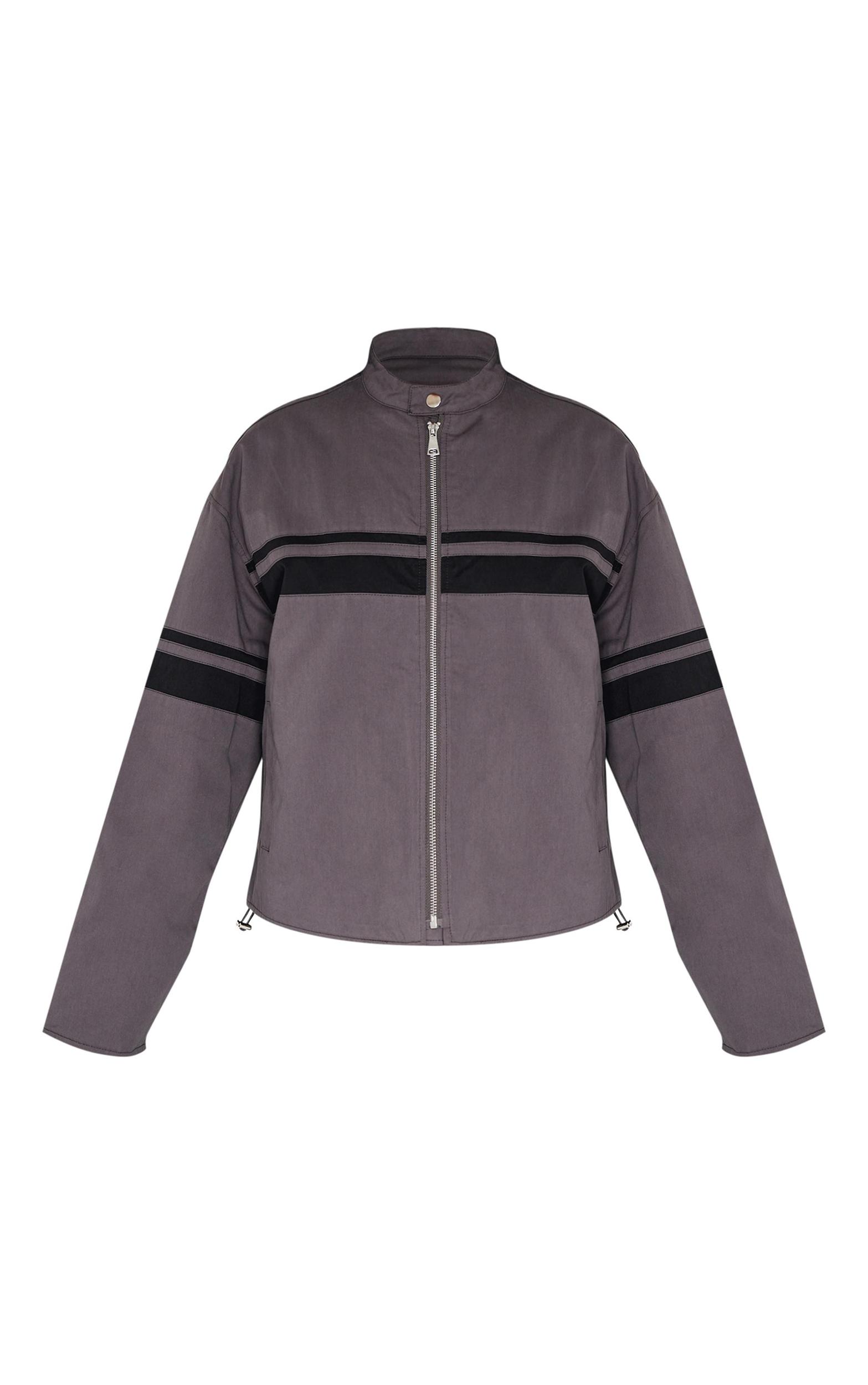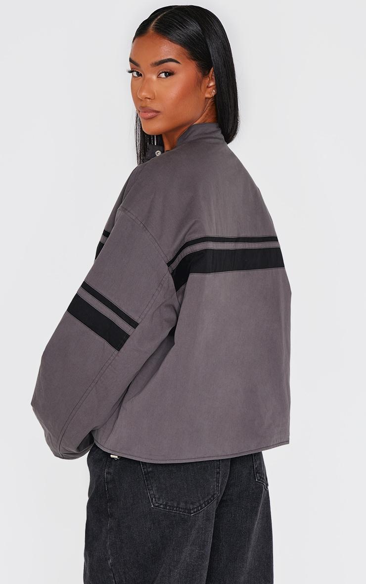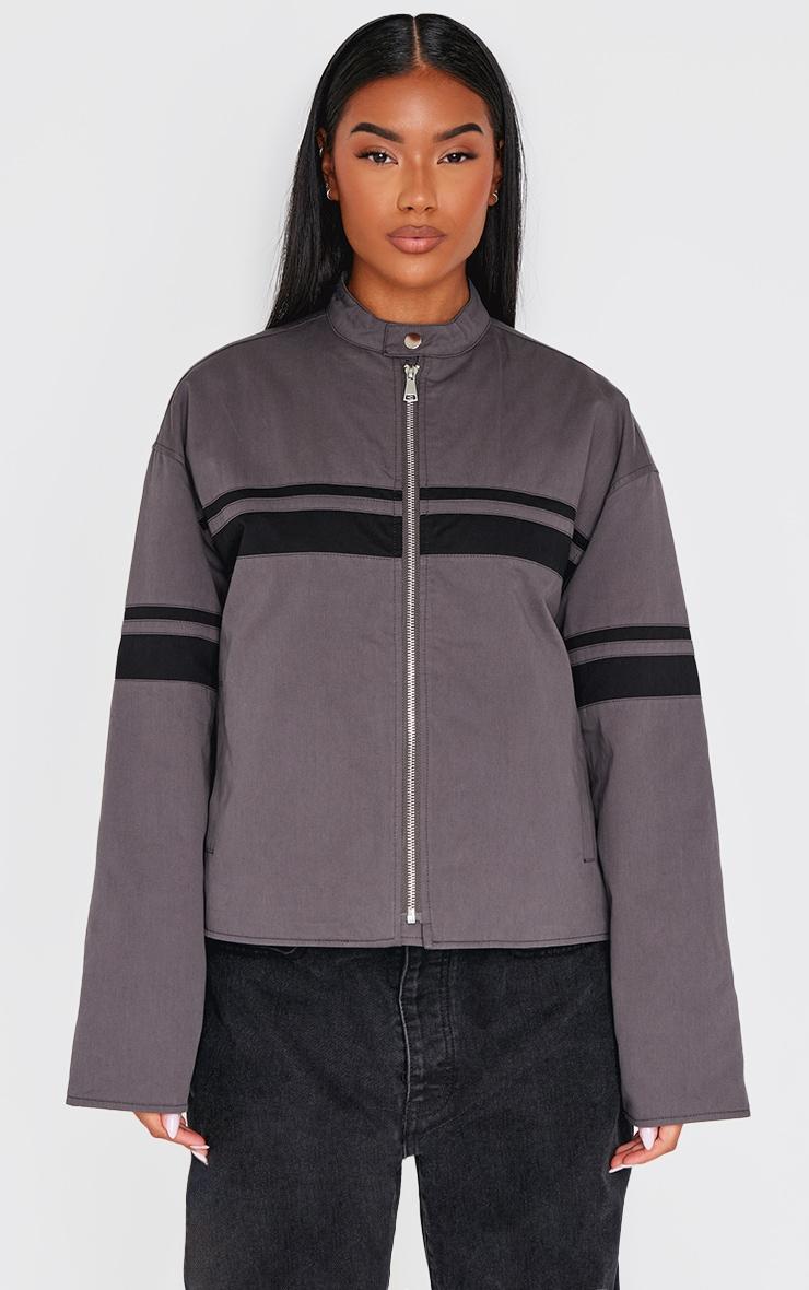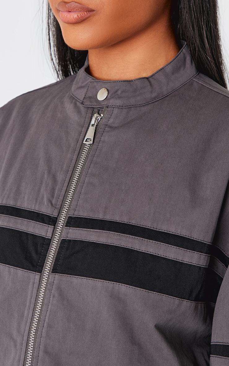Layer in style with this charcoal zip up stripe jacket this season. Brought to you in a charcoal hue material with a stripe design and zip up detail, this jacket is all the new you need. Pair with black bottoms and fresh kicks for a look like no other. It's a yes from us. Length approx 48cm/19inch (Based on a sample size S) Model wears size SModel Height - 5ft 8inchp]:!mb-0inch>Category: OuterwearProduct type: JacketColor: CharcoalMaterial: Cotton PoplinNeckline: CrewSleeves: LongOccasion: Day