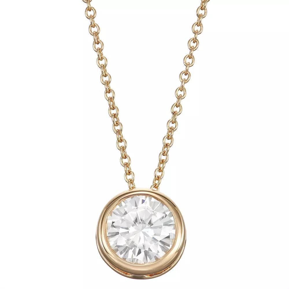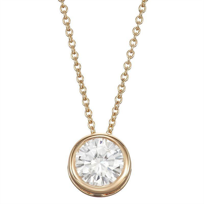 Dare to be different with this elegant and sophisticated bezel set Moissanite by Charles & Colvard® pendant necklace. This exceptionally charming 14K White Gold pendant features a 5-millimeter round Moissanite gem, comes with an 18-inch box style chain with a lobster claw clasp, and has a total diamond equivalent weight of 1/2-carat. | Charles & Colvard 1/2 Ct. T.w Lab Created Moissanite Solitaire Pendant Necklace, White, 18 In