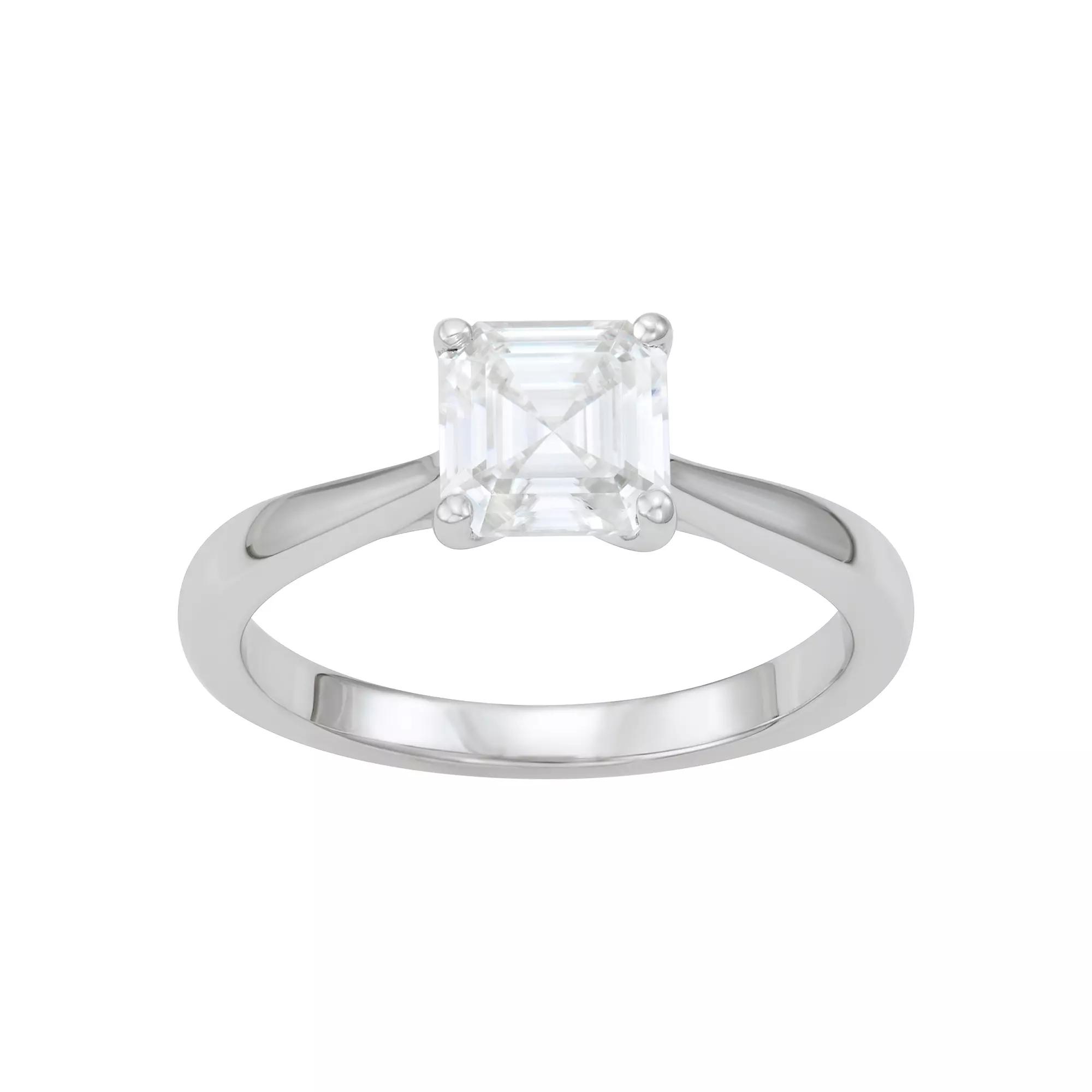 This ring has a sleek tapered band, with a solitaire four-prong Asscher cut 1.3 ct. t.w. Lab-Created Moissanite gemstone as the star of the show. A unique cut, this is a standout ring. So simply lovely, you'll be left speechless. | Charles & Colvard 1.3 Ct. T.w. Lab Created Moissanite Asscher Solitaire Ring In 14K White Gold, 9
