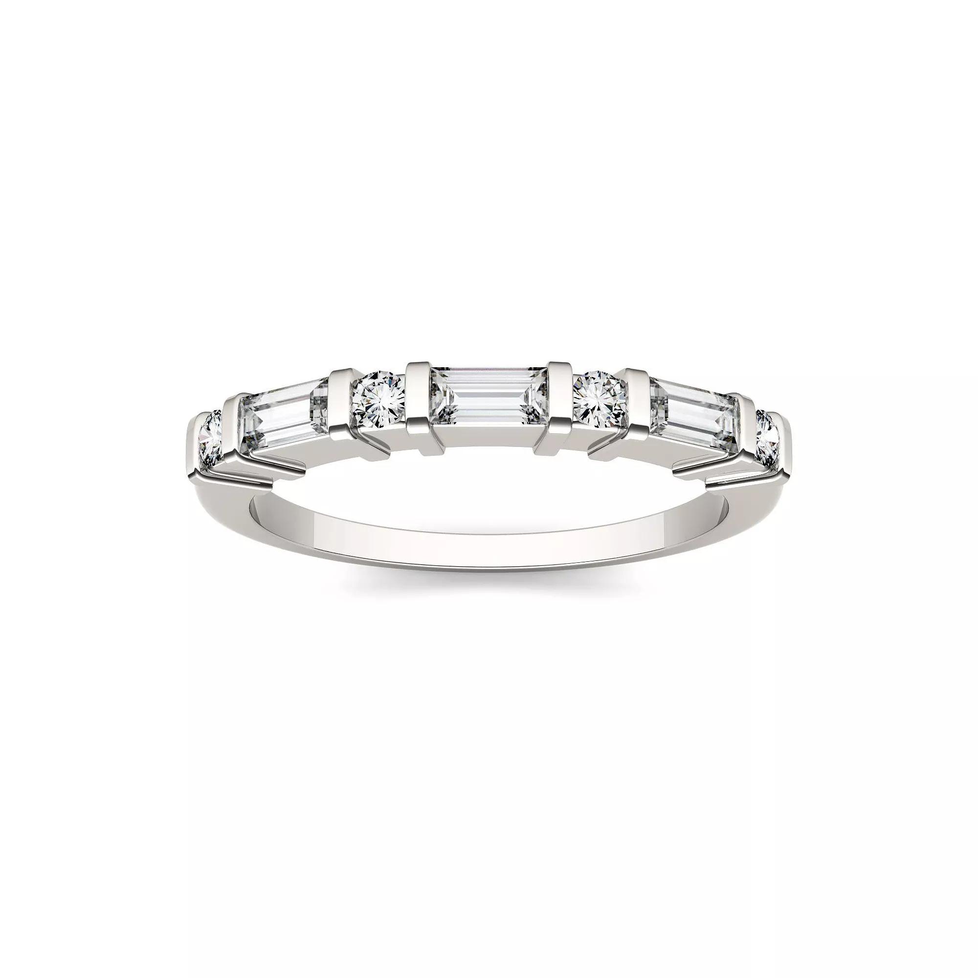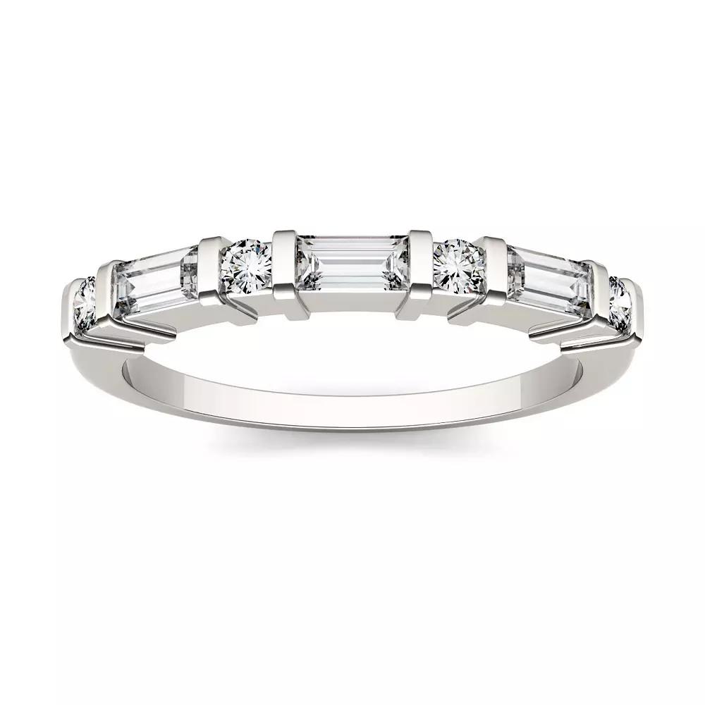 A sleek, beautiful band with a alternating baguette and round cut gemstones in a bar setting. Pair with other rings to create a whole look or wear alone for a bit of added shine. | Charles & Colvard 1/2 Ct. T.w. Moissanite Baguette Wedding Band In 14K White Gold, 6