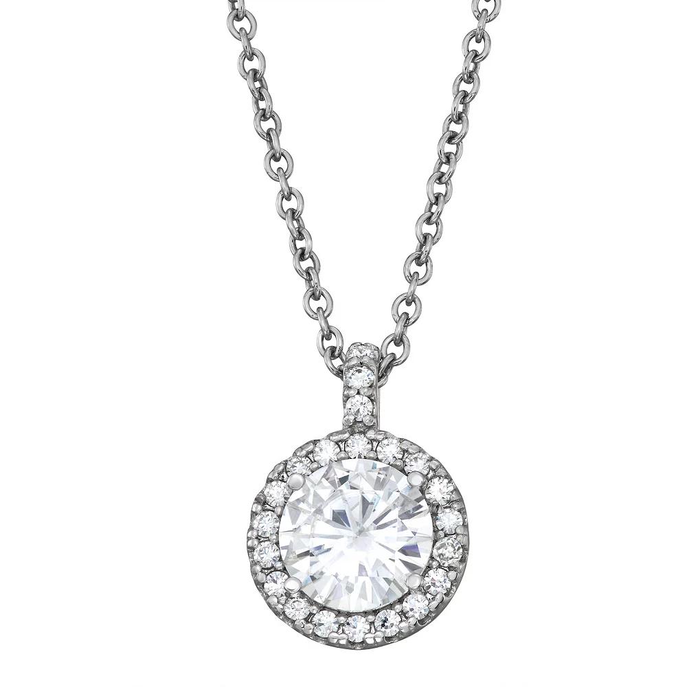 Beautifully appointed with lab-created moissanite stones, this Charles & Colvard halo pendant is a beautiful accessory. Beautifully appointed with lab-created moissanite stones, this Charles & Colvard halo pendant is a beautiful accessory. Chain length: 18 in. + 2-in. extender Chain type: cable Metal: 14k white gold Plating: rhodium Finish: polished STONE DETAILS Stone type: lab-created moissanite Total weight: 2 1/4 ct. Center stone weight: 1 9/10 ct. Center stone diameter: 8 mm Shape: round brilliant Setting: prong Diamond equivalent carat (ct.) Total Weight (T.W.) represents the approximate total weight of diamonds of equivalent appearance. Image(s) may be enlarged to show detail. Please note, due to the high value of this item, a signature may be required upon delivery. Size: 18". Gender: female. Age Group: adult.