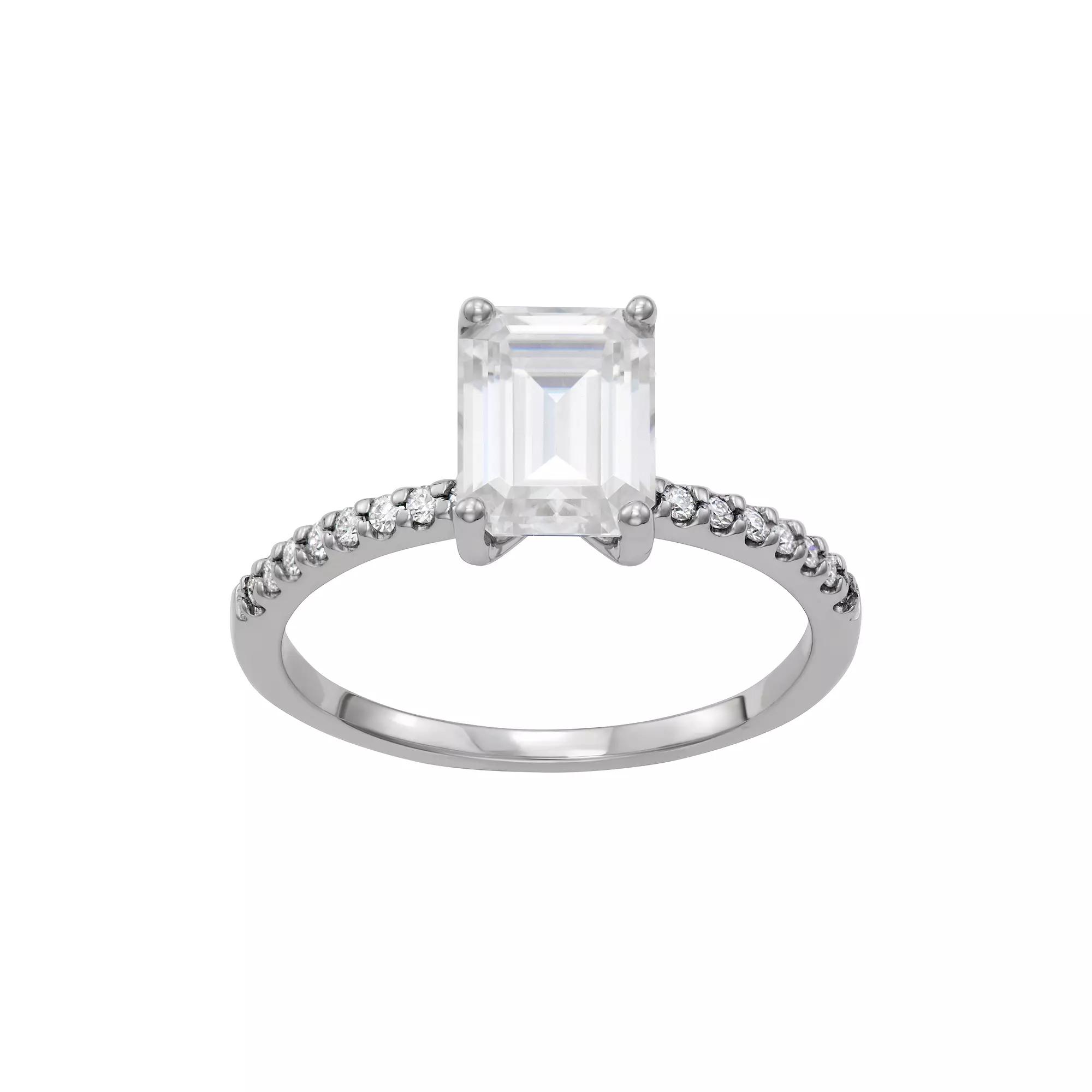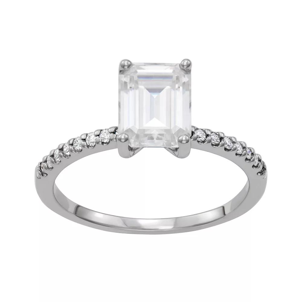 Adorned with emerald- and round-cut lab-created moissanite gemstones, this Charles & Colvard ring draws attention with its impressive design. Adorned with emerald- and round-cut lab-created moissanite gemstones, this Charles & Colvard ring draws attention with its impressive design. Metal: 14k white gold Plating: rhodium Packaging: boxed Width: 1.9 mm Finish: polishedSTONE DETAILS Stone type: lab-created moissanite Total weight: 2 3/4 ct. Center stone weight: 2 1/2 ct. Center stone size: 9 mm x 7 mm Shape: emerald cut Setting: prong Gemstones may have been treated to enhance their appearance. Special care may be required. Please visit our Gemstone Treatment & Special Care Guide for more information. Image(s) may be enlarged to show detail. Please note, due to the high value of this item, a signature may be required upon delivery. Gender: female. Age Group: adult.