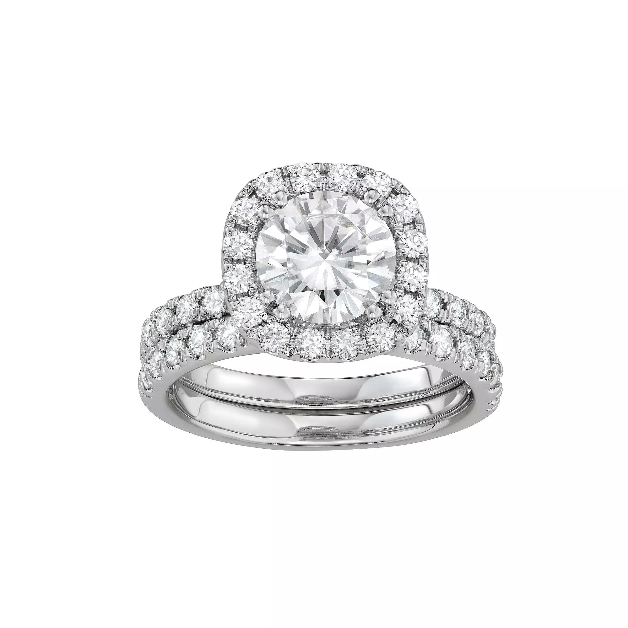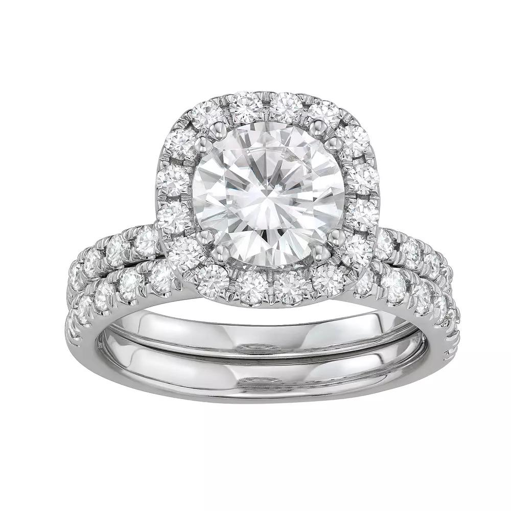 Behold the splendor of this Moissanite by Charles & Colvard halo bridal set. The center stone is 8-millimeter round moissanite surrounded by a halo of moissanite gemstones which also accent the shoulders. The matching wedding band is crafted from 14-karat white gold with additional shimmery accent stones. It features 2.98-carat total diamond equivalent weight and has enough sparkle to light her world. | Charles & Colvard Moissanite Wedding Set, White, 7