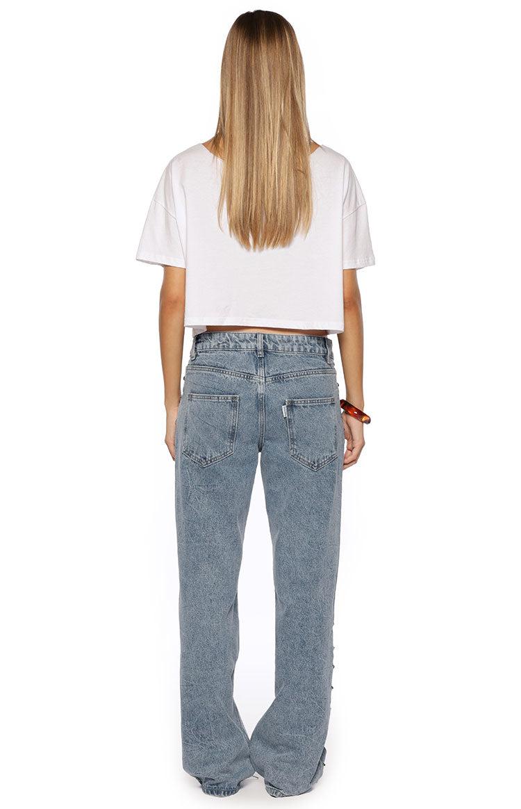 Mid Wash Studded Baggy Leg Jeans How to style: Make a statement in our Charli Mid Wash Denim Jeans, a bold update to your denim collection. These jeans are designed with a cool, low-rise waist and a loose, baggy leg, featuring silver stud detailing down the side seams for an edgy finish. Pair them with a baby tee or corset top and boots for your next festival or night out! Features: Mid wash denim Low rise Loose leg Full length Silver stud detail down the side seams Perfect for festivals, parties, and statement casual wear!