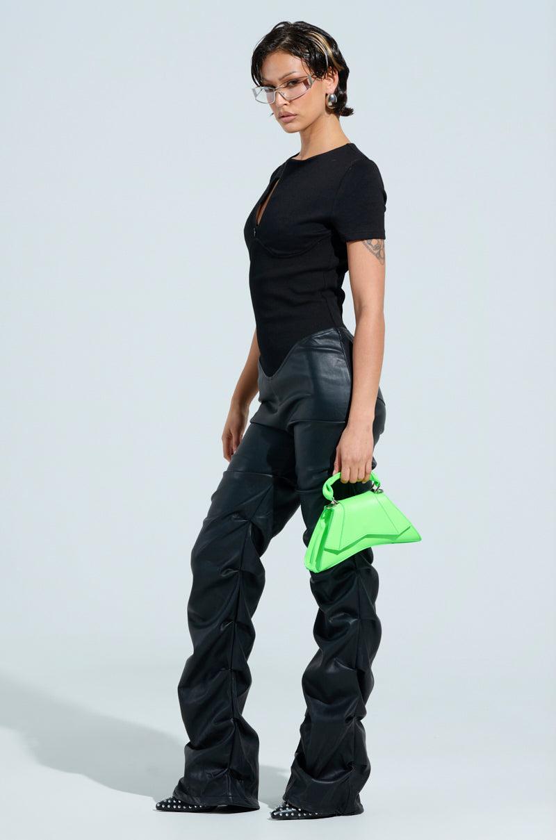 Sleek n’ sexy in The AKIRA Label Charli Stacked PU Jumpsuit In Black. This cool-girl piece boasts an upper half crafted from a sleek knit bae with a crew neckline, short sleeves, a front zipper closure, and underbust seaming. The midriff features a stretchy, curve-snatching elasticized waistband that leads into attached, tonal faux leather pants that show off a ruched construction, and elastic pant cuffs with bungee cord closures for a cinched look. Complete with a concealed back zipper closure, and a straight leg silhouette. Pair with stiletto pumps and a red lip for a sultry finish. - Top: 47.5% Viscose 47.5% Polyester 5% Spandex, Waist: 97% Cotton 3% Spandex, Bottom: 50% PU 50% Polyester- Stretchy- Imported (all measurements approximate from size small)- 63” Shoulder to Hem- 7” Sleeves- 14” Shoulder to Shoulder- Model is 5’7” and is wearing size small Product ID: 463321
