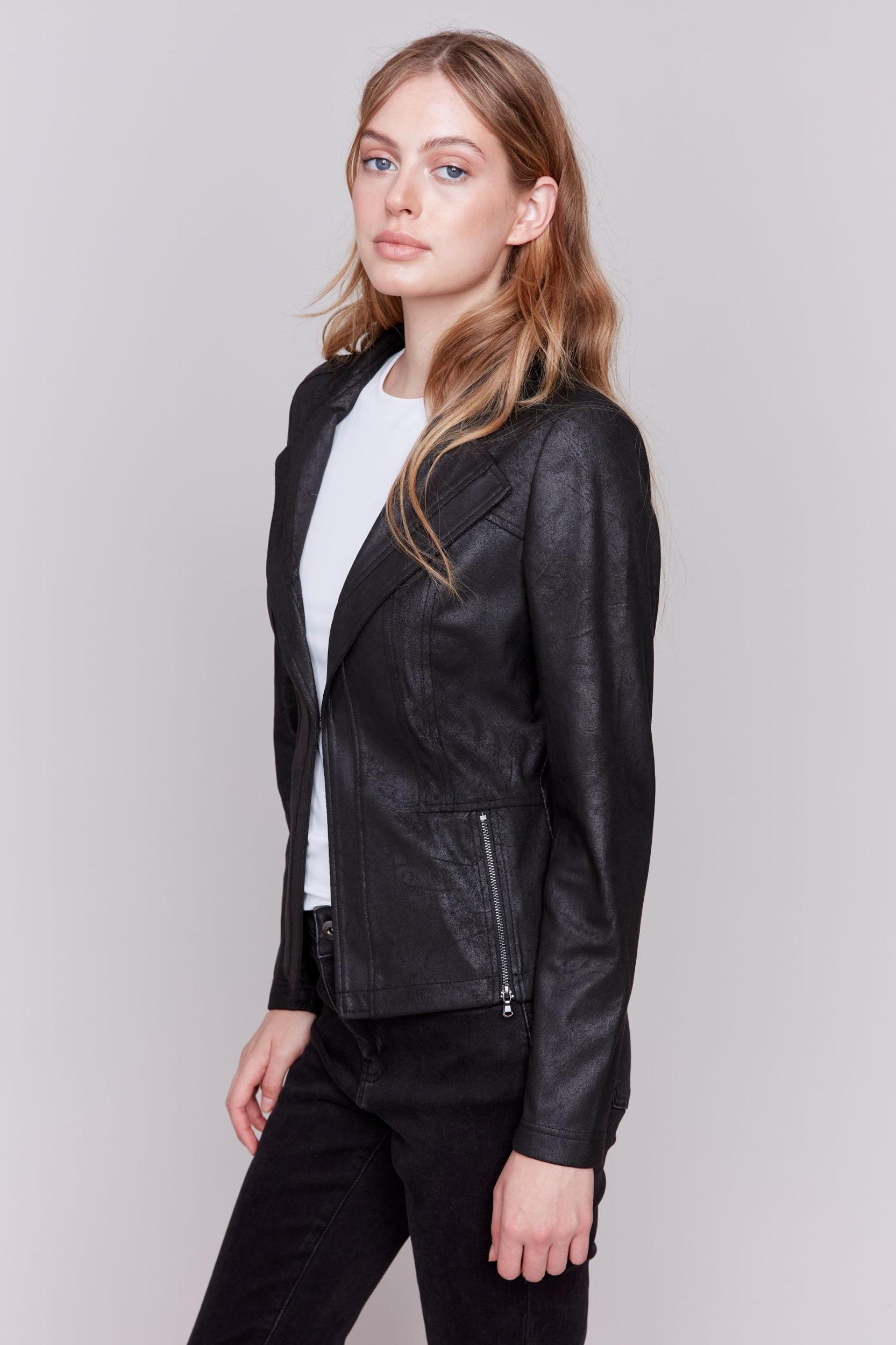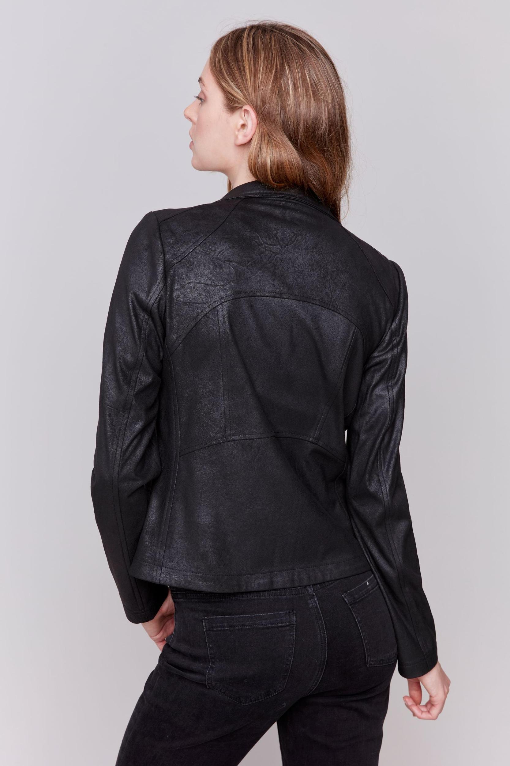Buttery soft, this faux leather Moto jacket by Charlie B will become your go-to for on the go. A single hook and eye closure, cool zipper detail on each side and perfect seaming come together to make this one dynamite jacket. Hand wash and line dry.