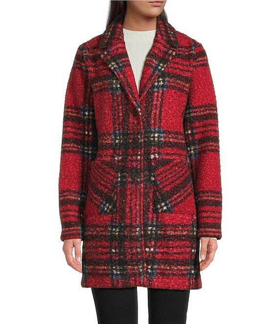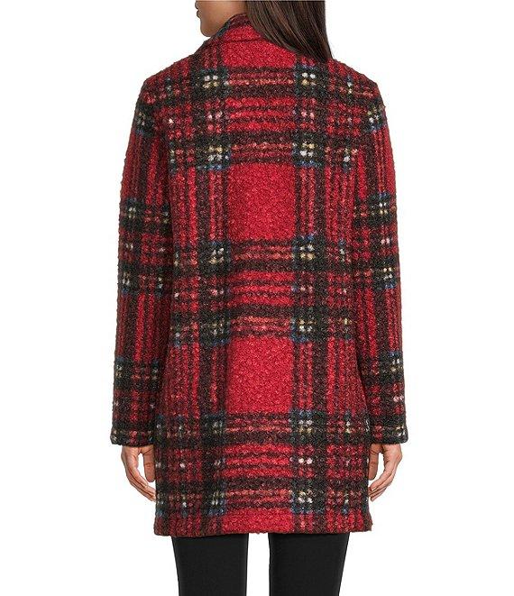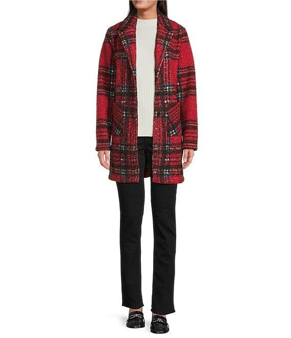 Charlie B. Boucle Knit Plaid Print Notch Collar Long Sleeve Coat