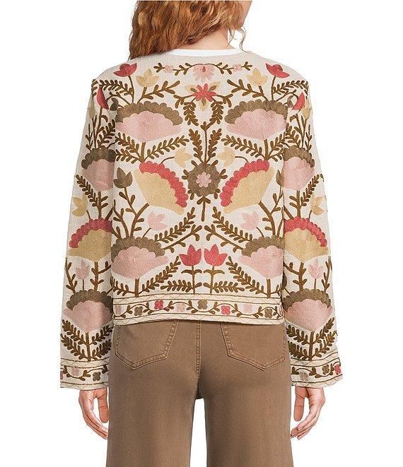 From Charlie B., this jacket features: Collarless Long sleeves Open front; no closure Embroidered details Mid length Straight hemline Approx. 22.5" back length Cotton Hand wash Imported.