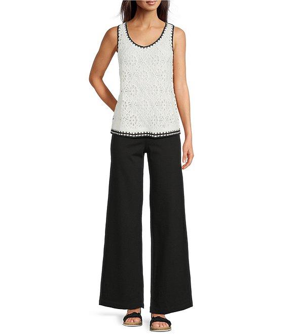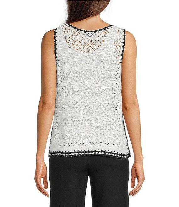 From Charlie B., this top features: Crochet knit fabrication V-neckline Sleeveless Contrast trim Straight hemline Pullover construction Approx. 23" length Cotton/acrylic Hand wash Imported.