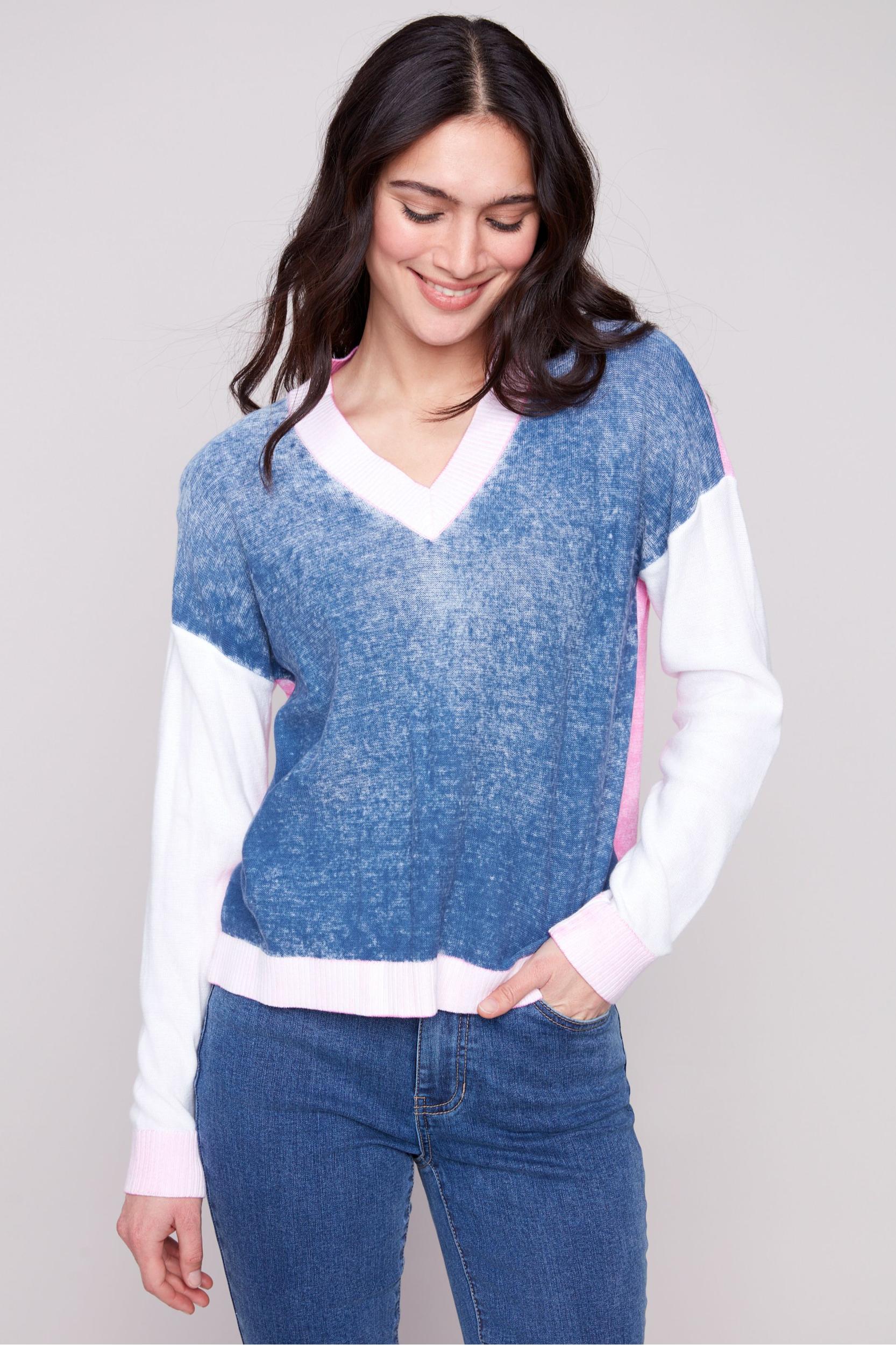 Dive into comfort with this charming color block V-neck sweater. Its rich denim blue tones contrast beautifully with the soft, delicate hues of white and pink. Made entirely of soft cotton, it offers unmatched comfort and a cozy fit. Whether paired with jeans or shorts, this sweater is a versatile addition to your spring & summer wardrobe.