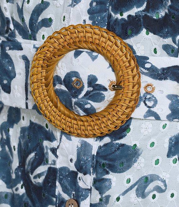 From Charlie B., this dress features:Eyelet fabricationFloral print V-necklineShort sleevesSelf belted waist with round buckleMidi lengthButton front closureApprox. 51" lengthCottonMachine wash Imported.