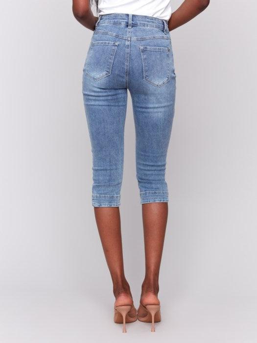These are an awesome denim capri for the spring/summer, they have a button and zipper fly and functional front and back pockets! They are made of 98% Cotton, and 2% Spandex, making them lightweigth while also giving them a nice stretch. Machine wash in cold water and hang to dry.