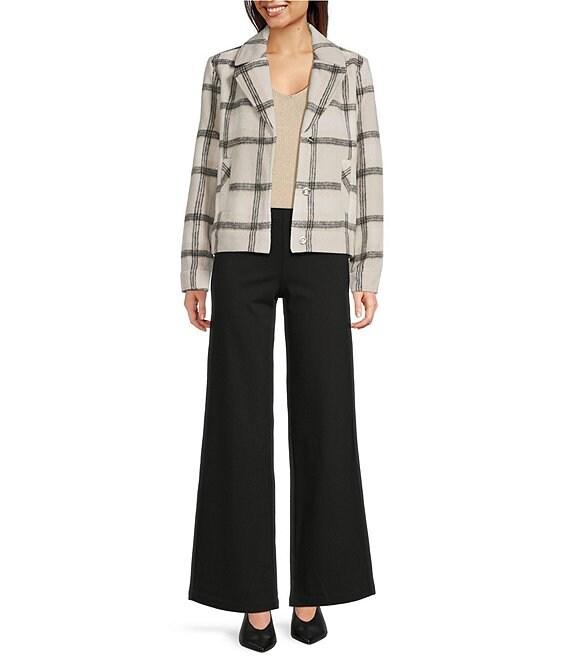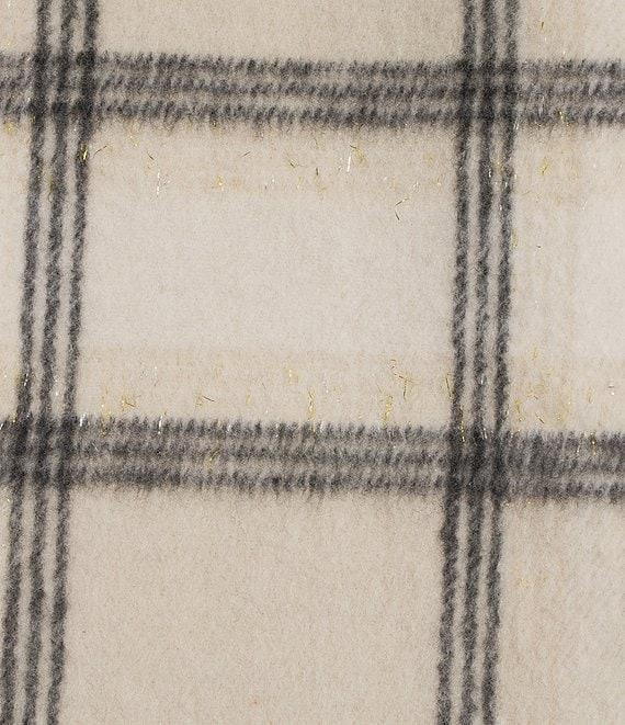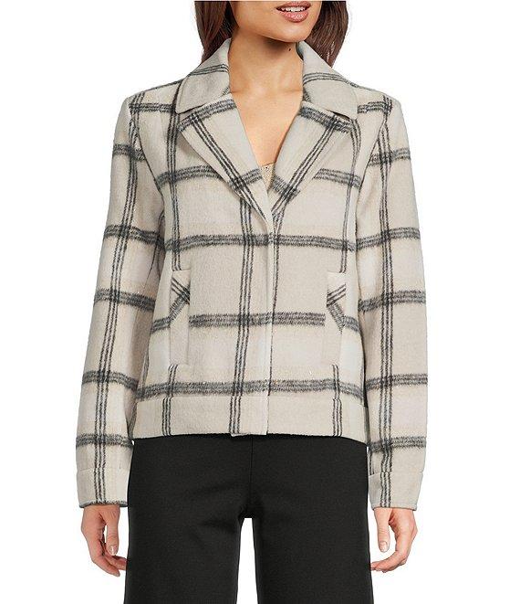 From Charlie B., this coat features: Lurex knit fabrication Notch collar Long sleeves Plaid pattern Front functional welt pockets Straight hemline Button front closure Approx. 23.5" back length Polyester/wool/acrylic/viscose Machine wash Imported.