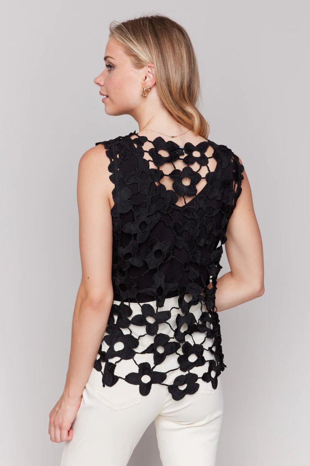 Embrace the elegance of this sleeveless top, featuring stunning floral crochet accents. Ideal for sunny days and warm evenings, its lightweight design is both delicate and eye-catching. The classic black color adds a feminine touch, making it a versatile and flattering choice for any spring or summer occasion.