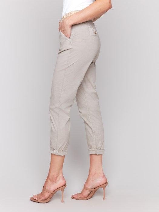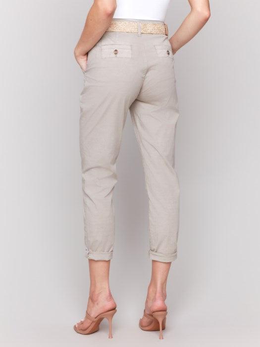 This lightweight, slim leg pant has pockets and a button and zipper closure. It is a cropped length and it's made of 97% cotton and 3% spandex. Cool and comfortable even on the hottest days and can be worn as an ankle or a cropped Capri. Washable.