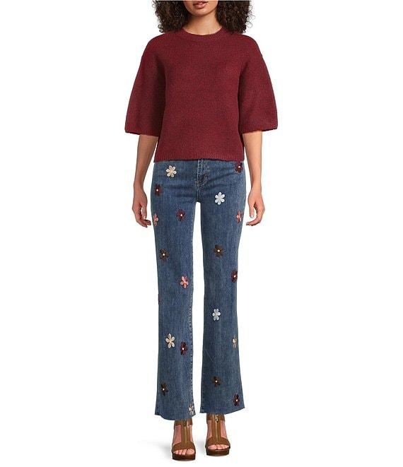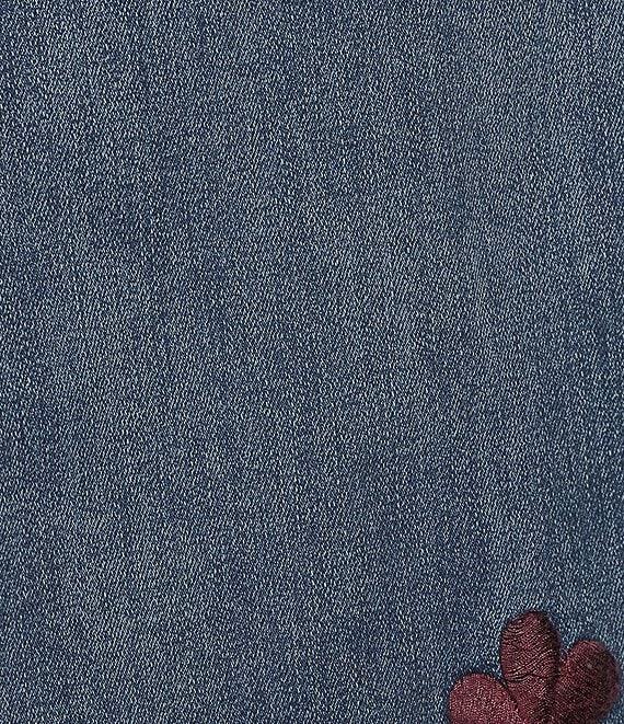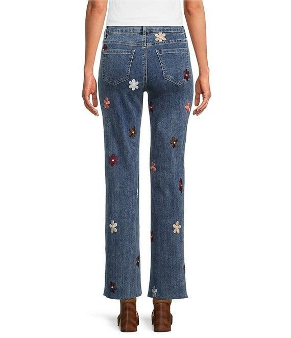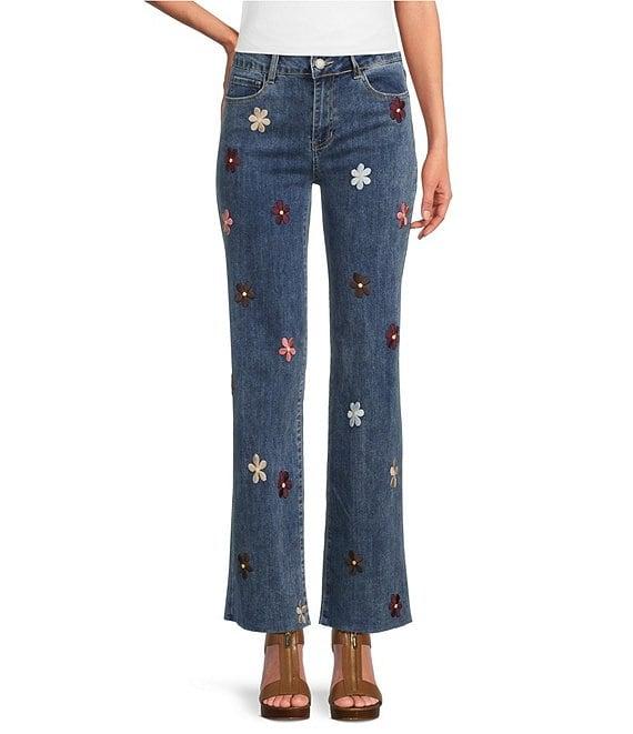 From Charlie B., these jeans feature: Stretch denim fabrication Wide leg silhouette All over flower patches 5 pocket styling Belt loops Mid rise Ankle length Front button and zipper closure Approx. 31" inseam, 11" leg opening Cotton/viscose/polyester/spandex Machine wash Imported.