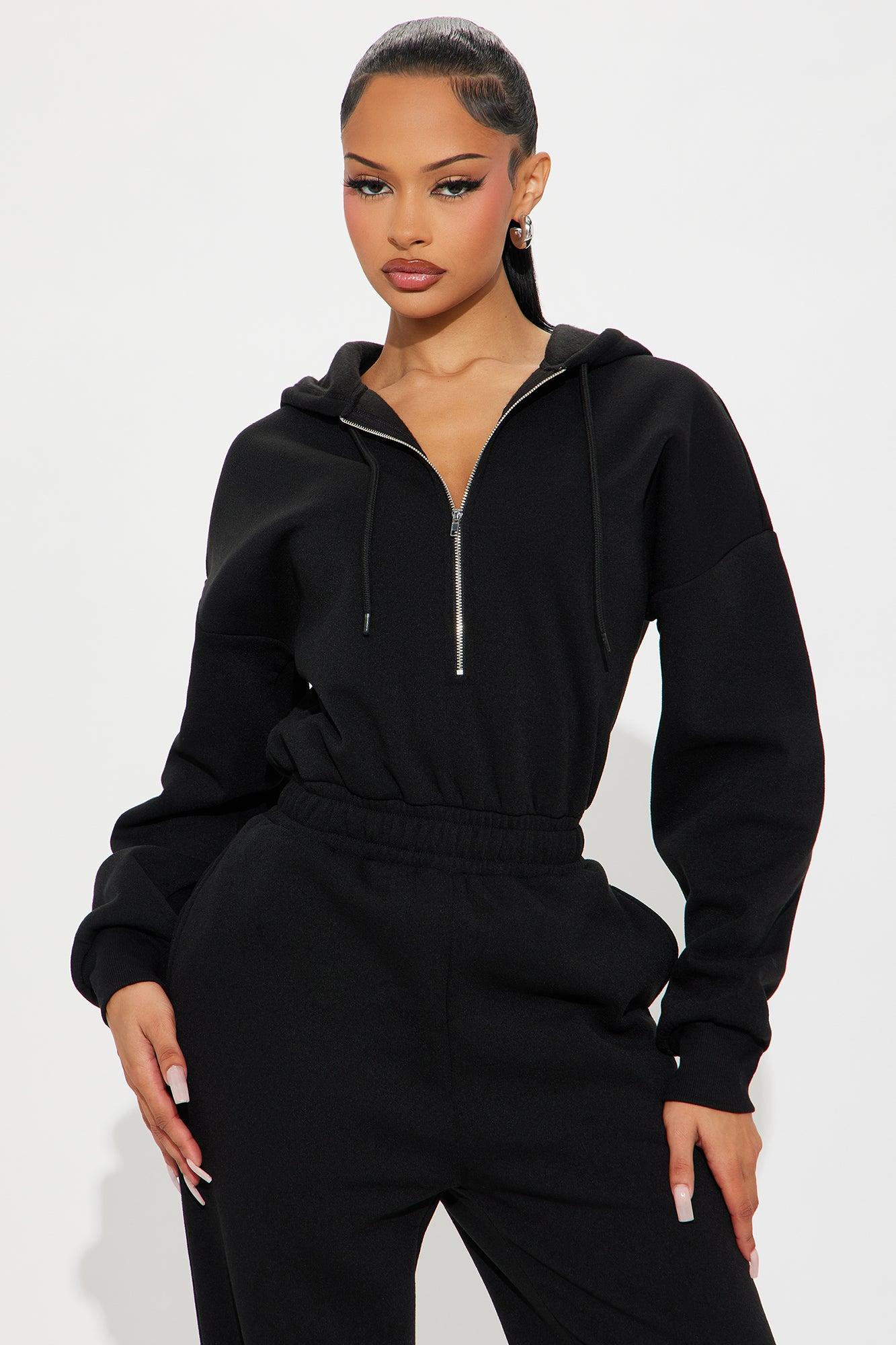 Available In Black And Heather Grey. Hoodie Quarter Zip Jumpsuit Stretch Hand Pockets Comfort Fit Mid Zip Up Wide Leg Self: 100% Polyester Contrast: 62% Polyester 33% Cotton 5% Spandex Imported California Proposition 65WARNING: Cancer and Reproductive Harm - www.P65Warnings.ca.gov.