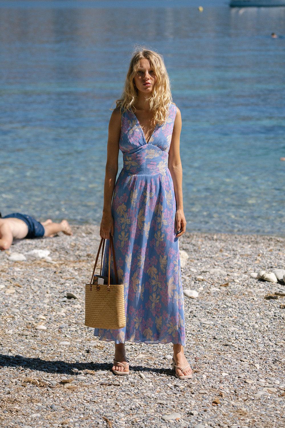 Inspired by a vintage piece on a night out in Paris, the SABO LUXE Charlie Pleated Dress is made from a luxurious pleat chiffon fabric with our exclusive iris vacay print. It features a tie at back, V neckline, contrast pleat direction at waist and a flowy midi skirt. Complete the look with the Lena Mules! Designed exclusively by Sabo.