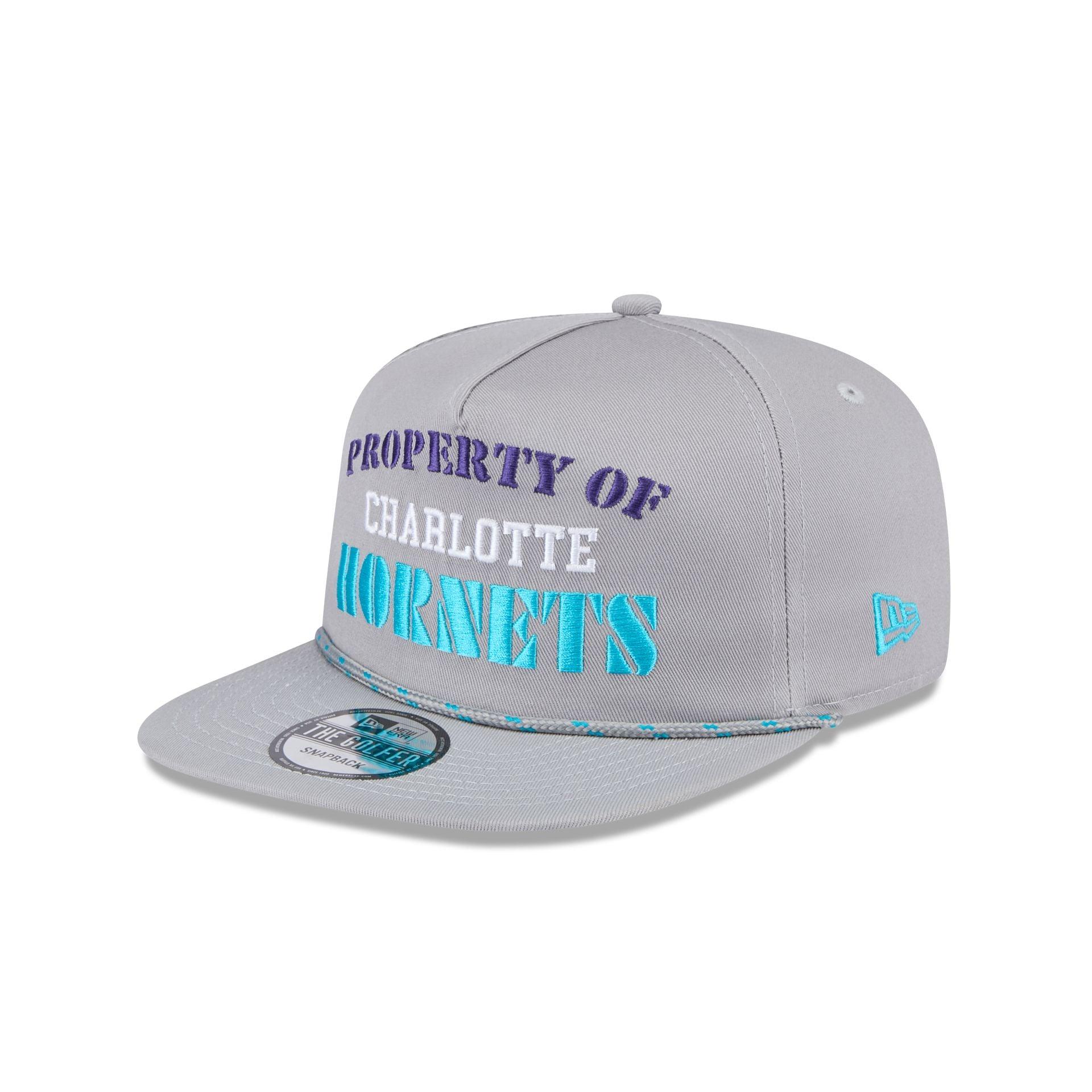 The Charlotte Hornets Vintage Gray Golfer features an embroidered "PROPERTY OF" Hornets wordmark at the front panels with a team logo at the right-wear side and a rope at the visor. Additional details include a snapback closure at the rear and a green undervisor.