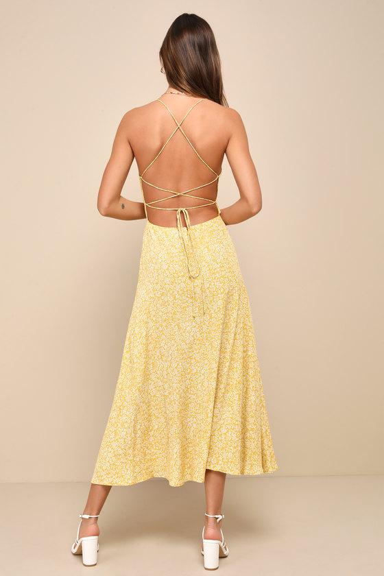 When you're striving to look effortlessly breathtaking, the Lulus Charming Dedication Yellow Floral Sleeveless Lace-Up Midi Dress will always ensure that everyone admires your style! Lightweight crepe woven fabric boasts a floral-inspired print throughout as it shapes a sleeveless bodice, a straight neckline, and slender straps that lace down the open back. A fitted waist tops a breezy A-line skirt that falls to a midi hem with a flirty side slit. Hidden back zipper/clasp.