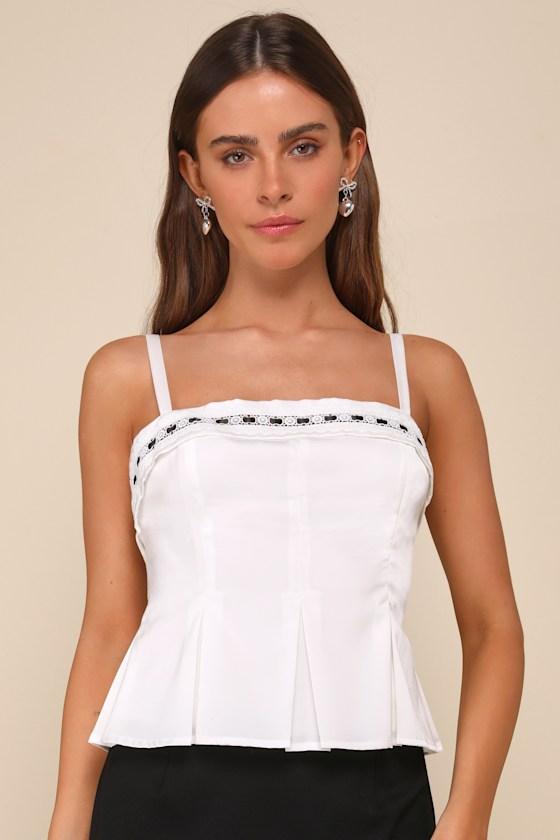 Elevate your day-to-day looks with the Lulus Charming Design White Crochet Lace Pleated Ribbon Tank Top! Lightweight woven fabric shapes this sweet tank top that has adjustable spaghetti straps and a straight neckline with crochet lace trim and a contrasting black satin ribbon. Seamed bodice continues down to a box-pleated hem. Hidden zipper/clasp at back.