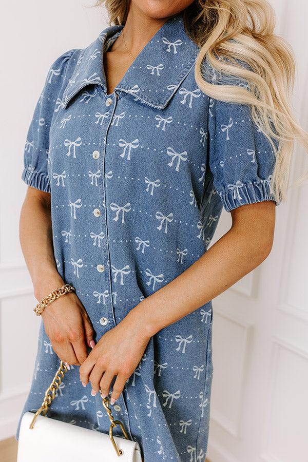 - Fall in love with coquette cuteness with this sweet denim mini! Its timeless denim material gets a trendy twist with its adorable bow pattern. Let your feminine charm take center stage with this darling dress!