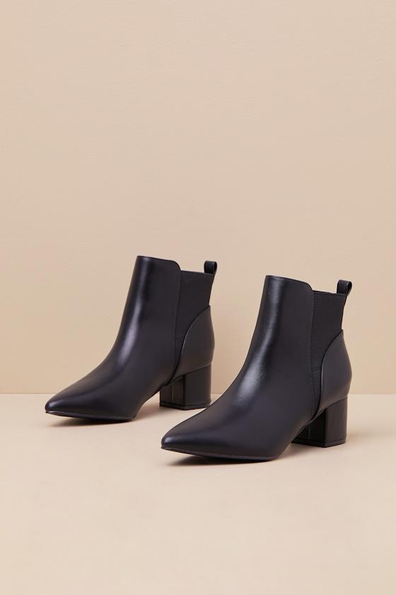 Step out looking sleek and chic in the Lulus Chase Black Pointed Toe Ankle Booties! These stylish slip-on booties have a smooth faux leather construction that shapes a pointed toe upper while trendy elastic gussets along the ankle-high shaft complete the look! Pull tab at back makes for easy on-and-off.