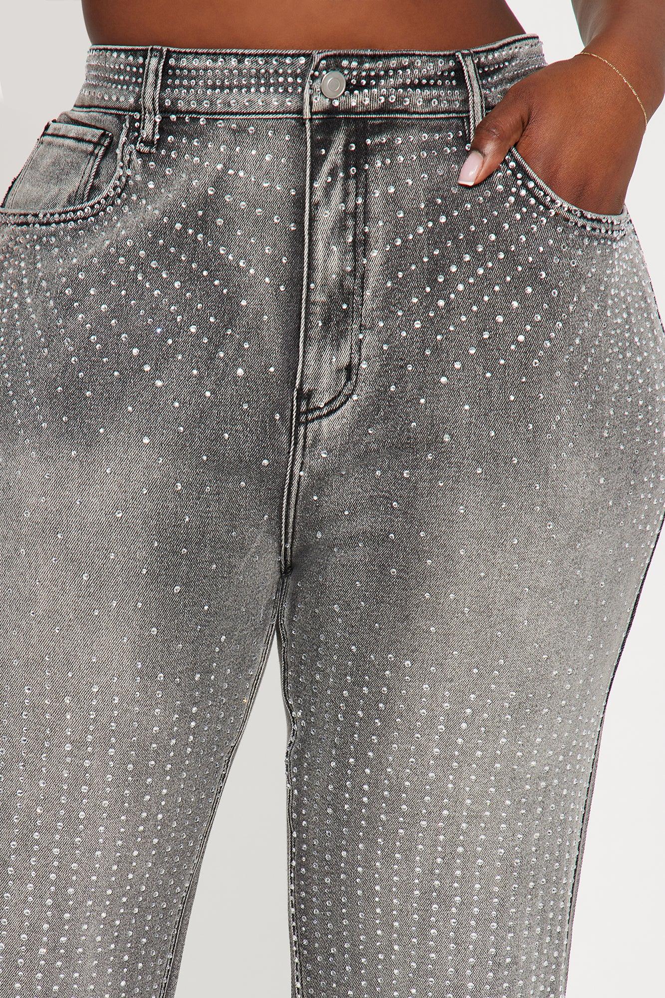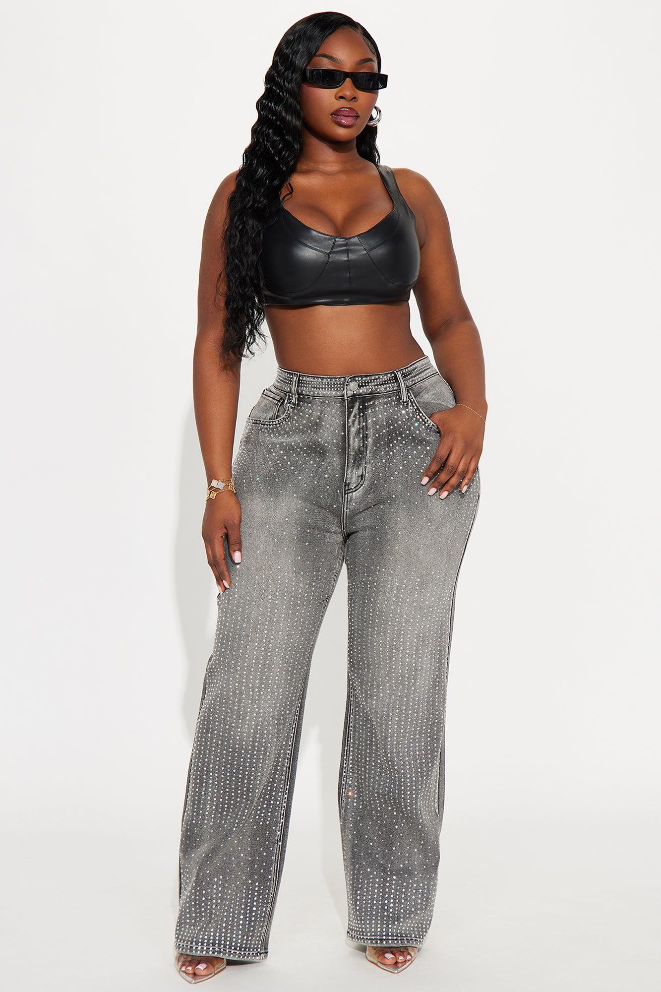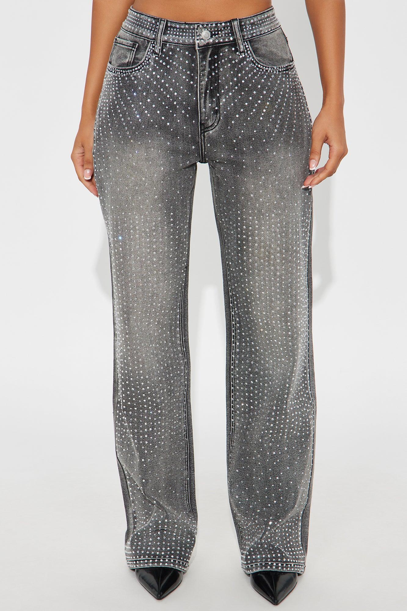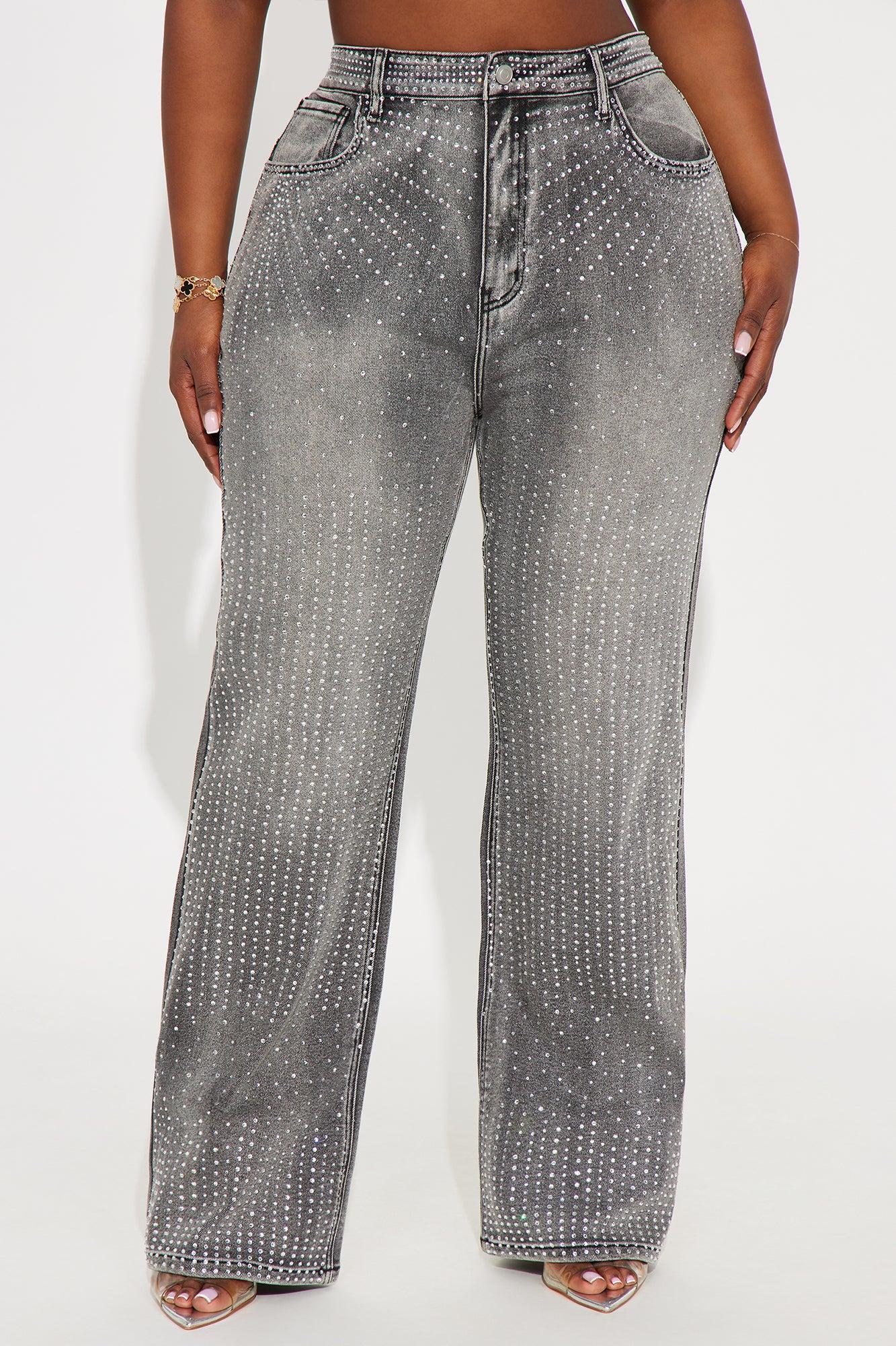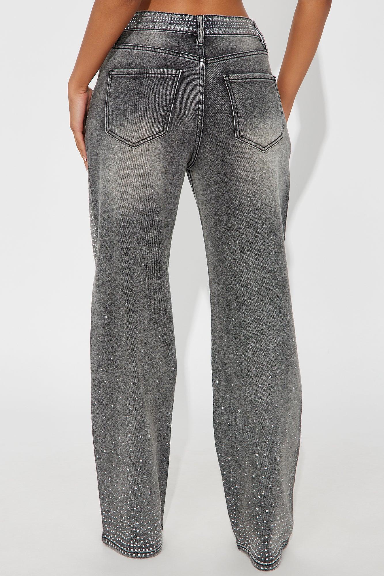 Available In Black And Grey. Straight Leg Jean 5 Pocket Embellished 32" Inseam 11" High Rise Low Stretch Disclaimer Due To The Specialized Wash Process, Each Garment Is Unique. 73.9% Cotton 25.5% Polyester 0.6% Spandex Imported California Proposition 65WARNING: Cancer and Reproductive Harm - www.P65Warnings.ca.gov.