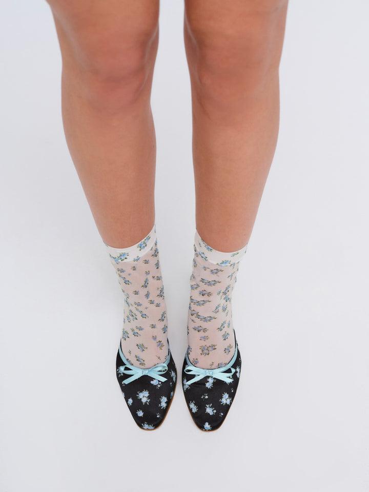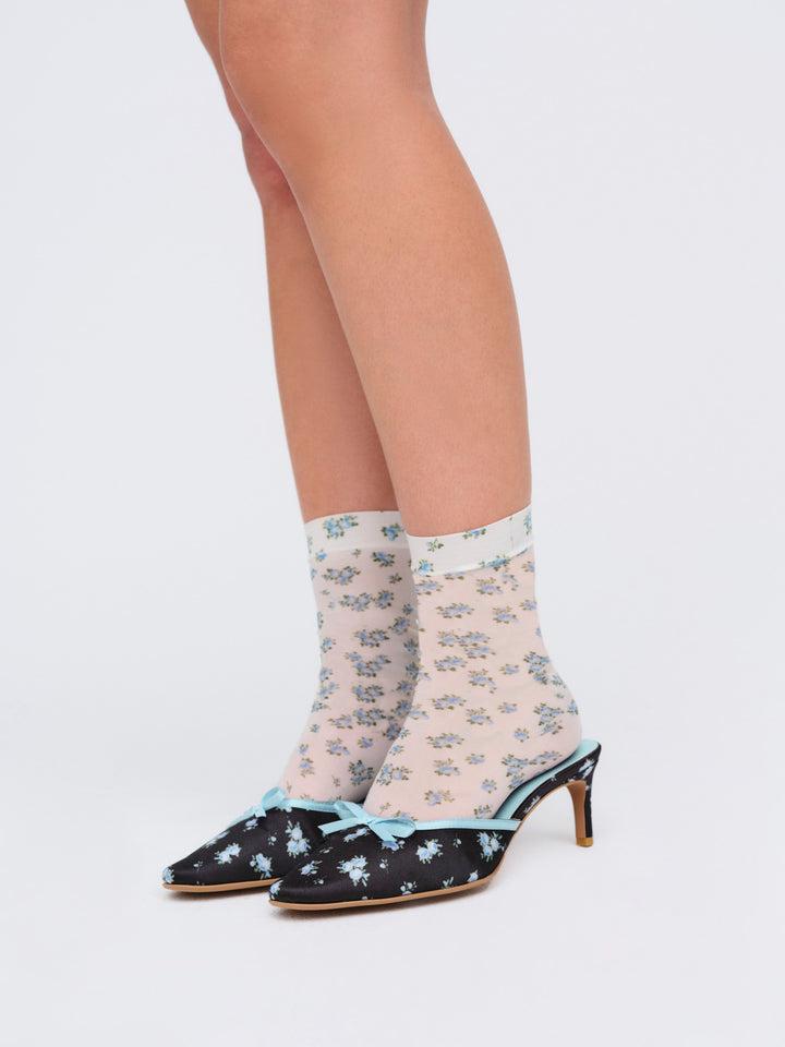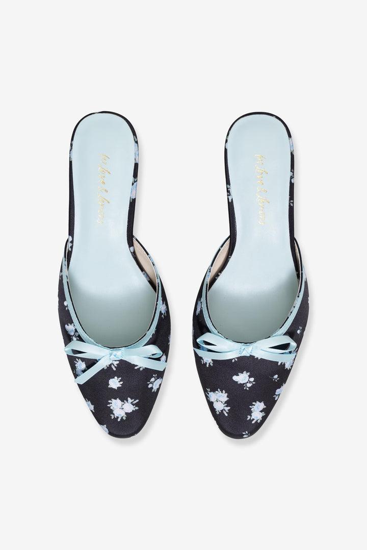 Designed for the Muse who lives in a world of her own, the Chateau black mule evokes the designs of a bygone era with its romantic blue floral print and satin bow. Pair these mule heels with floral socks from our pre-fall collection for an alluring look.
