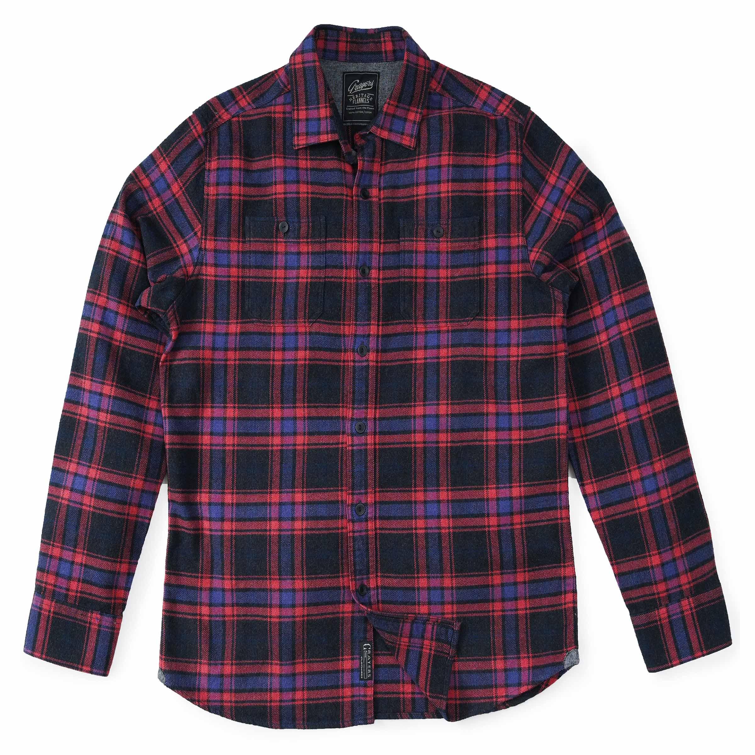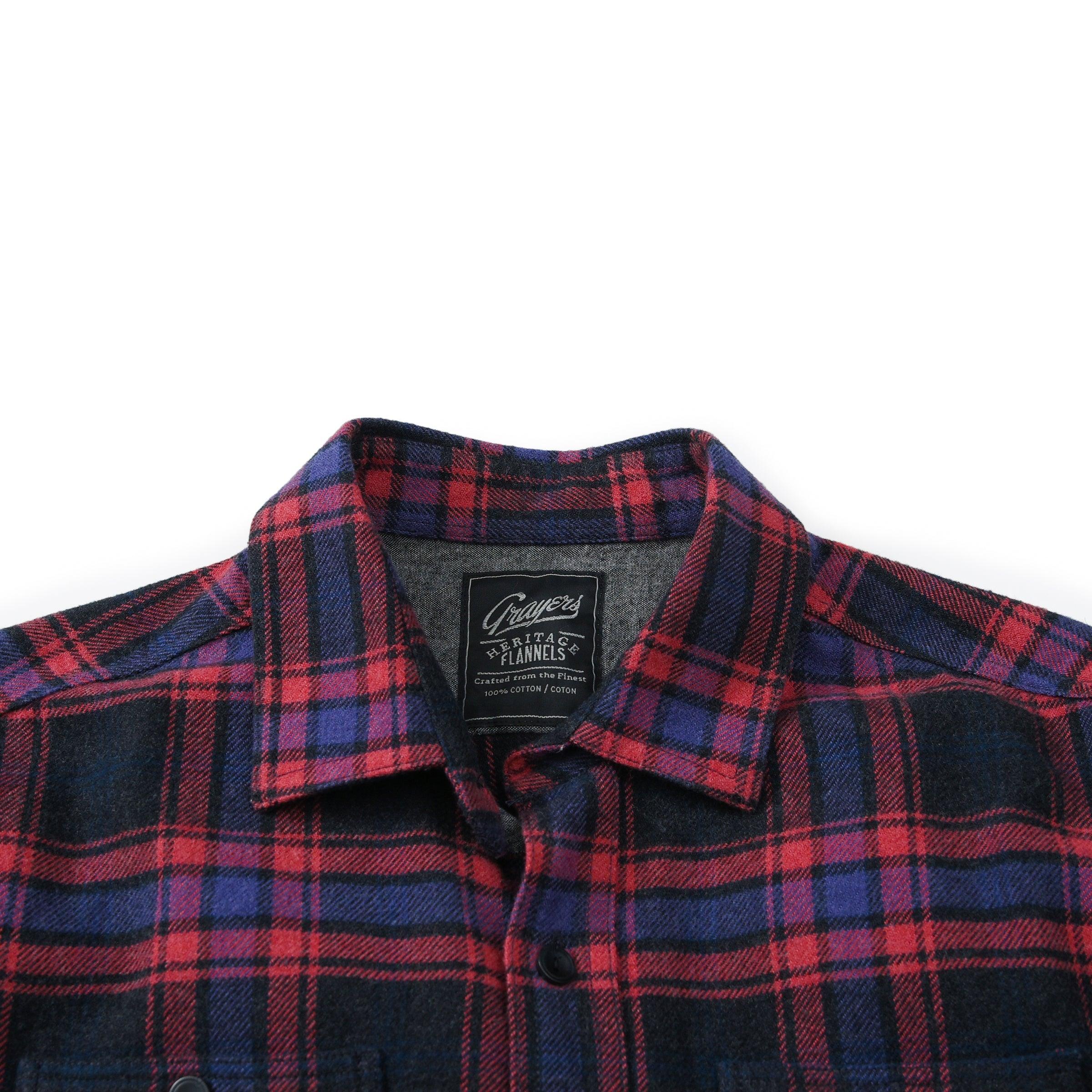 THIS ITEM IS FINAL SALE. NO REFUNDS OR EXCHANGES ALLOWED. This product will ship within 4 to 5 business days. It may arrive separately from other products in your cart. Built to last, best selling flannels. Last 100 years? Built like a Mack truck? As soft as a babys bottom? Yes, yes, and yes. Weighing in at 8.7 ounces, the Chaucer Heritage flannel comes in a unique heatherd charcoal and red plaid with a shot of blue in it. It's made out of the softest heather brushed twill flannel out there. What makes it extra special? We design all of our own stripes, patterns and plaids. We weave our own fabric. And our fit is on point. Wear it open like a work shirt or buttoned-up. Chest pockets each with a button closure Finished with a chambray yoke, cuffs and placket Grayers signature Modern Fit 100% Cotton Imported