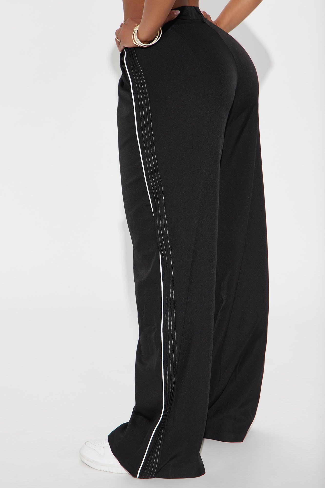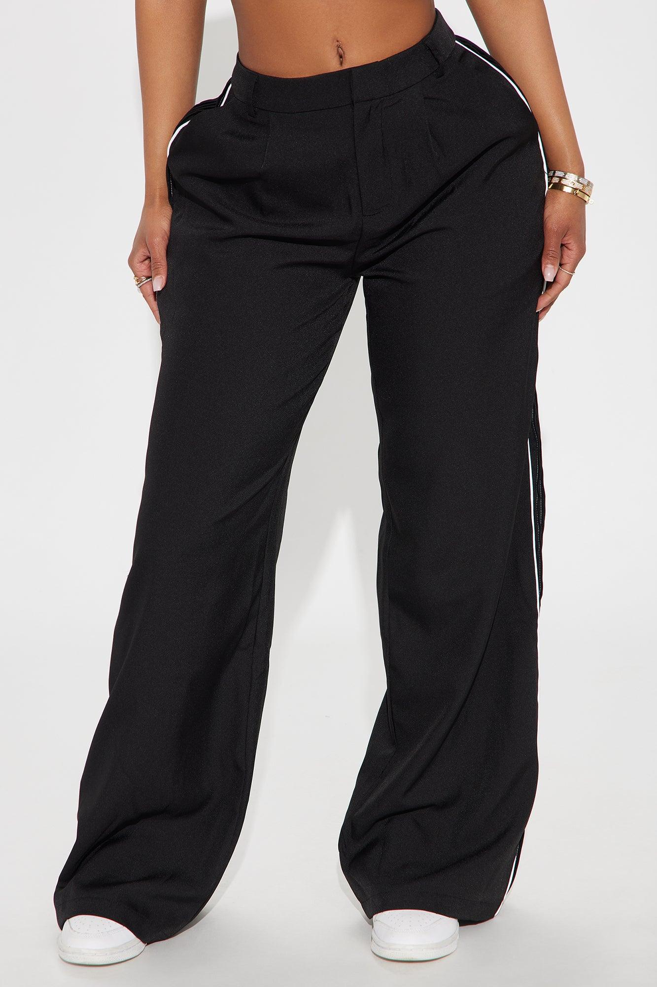 Available In Black. Track Trouser Pant Mid Rise Hook & Eye Closure Zip Fly Hand Pockets Side Seaming Detail Side Stripe Wide Leg Non Stretch 32" Inseam 95% Polyester 5% Spandex Imported California Proposition 65 WARNING: Cancer and Reproductive Harm - www.P65Warnings.ca.gov.