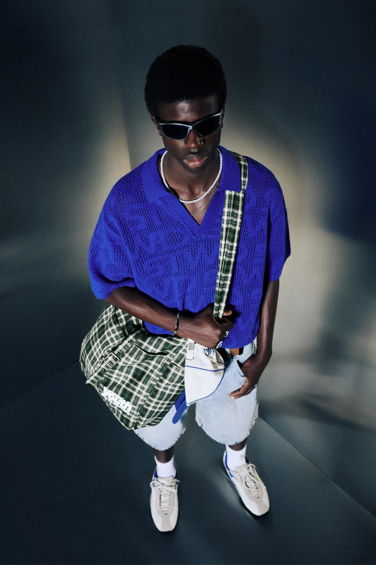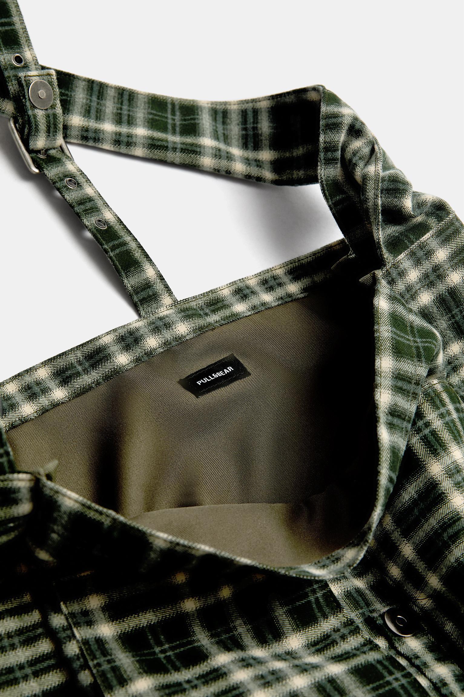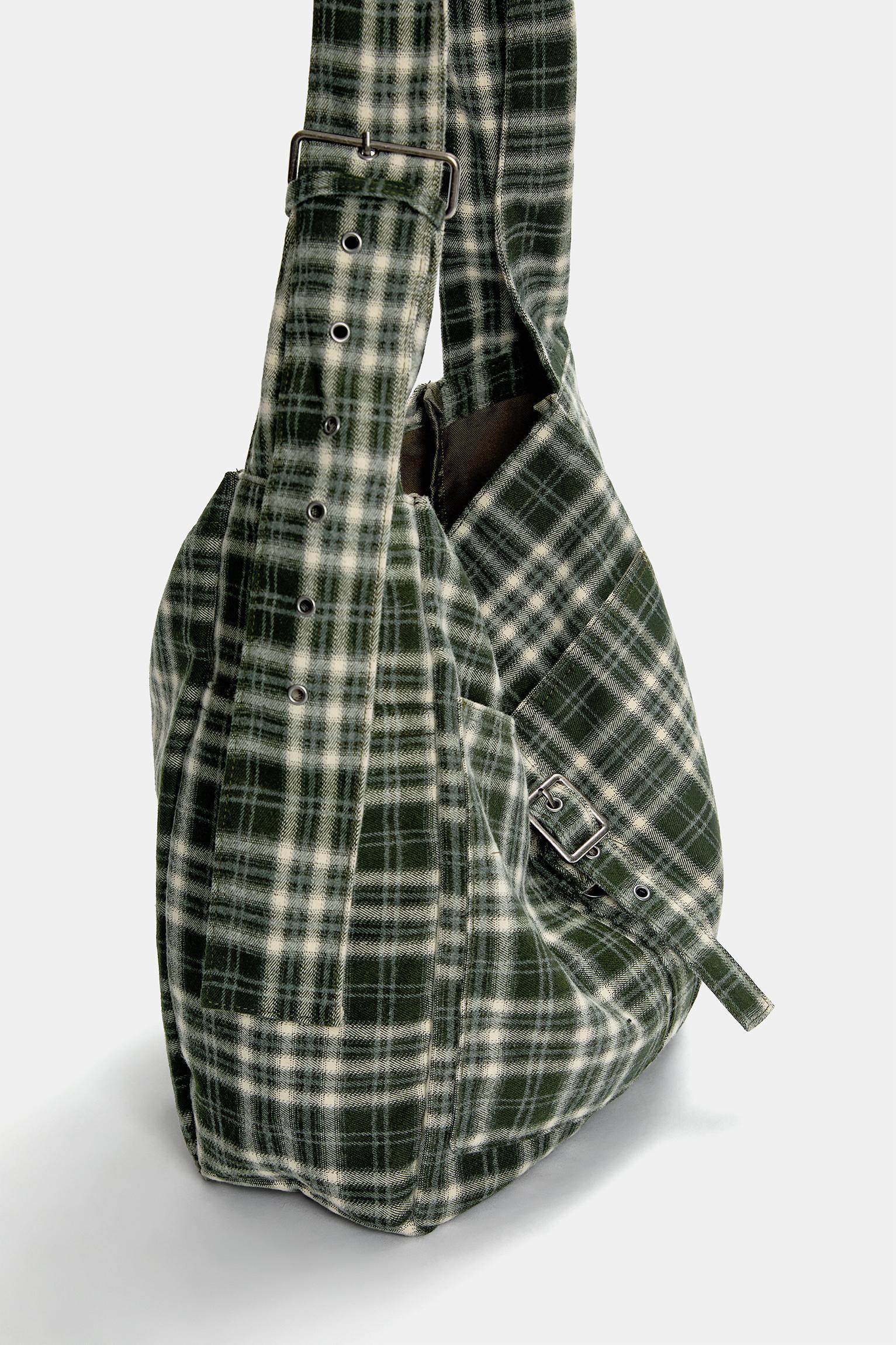 Checked fabric crossbody bag available in green. Buckled strap detail. Long adjustable strap. Strap fastening with magnet. Height x Length x Width: 34 x 34 x 15 cm.