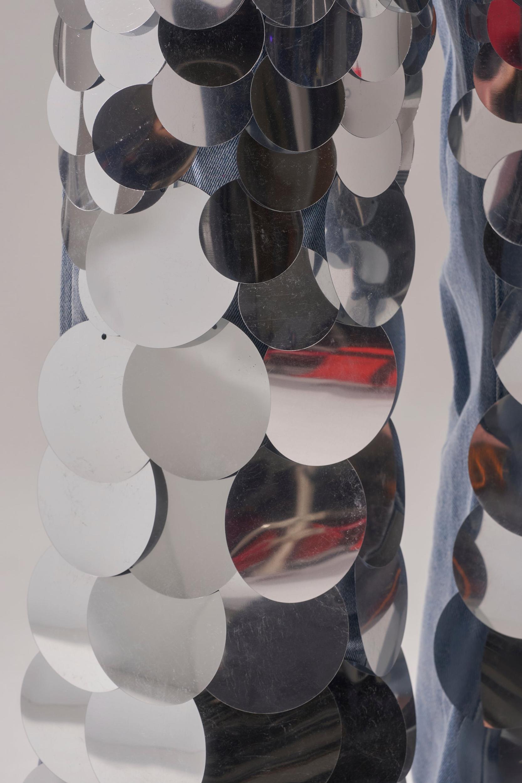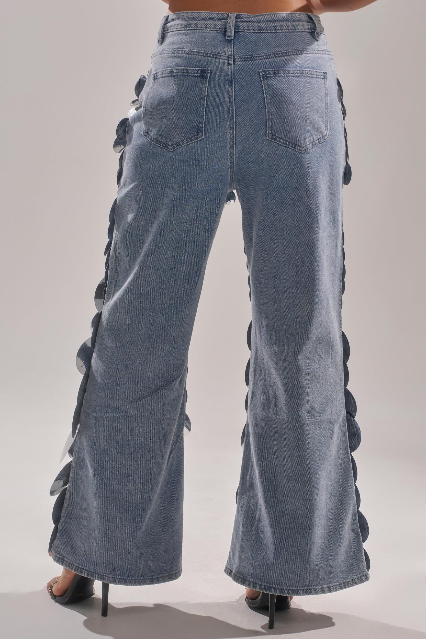 Dare to dazzle in The AKIRA Label Check It Out Sequin Denim Pant. These unique jeans are crafted from supple, vintage-wash blue denim and feature a mid-rise fit with subtly flared pantlegs, functional belt loops, a five-pocket design, and a standard zip-button front closure. Oversized silver sequin discs cascade from hip to hem for a fabulously flashy finish. Style them with a slinky chainmail halter top and silver stilettos for a party-perfect look. - 88% Cotton, 10% Polyester, 2% Spandex- Slight Stretch- Imported (all measurements approximate from size small)- 12” Rise- 30” InseamProduct ID: 1065884 (all measurements approximate from size 1X)- 15” Rise- 30.5” InseamProduct ID: 1065888
