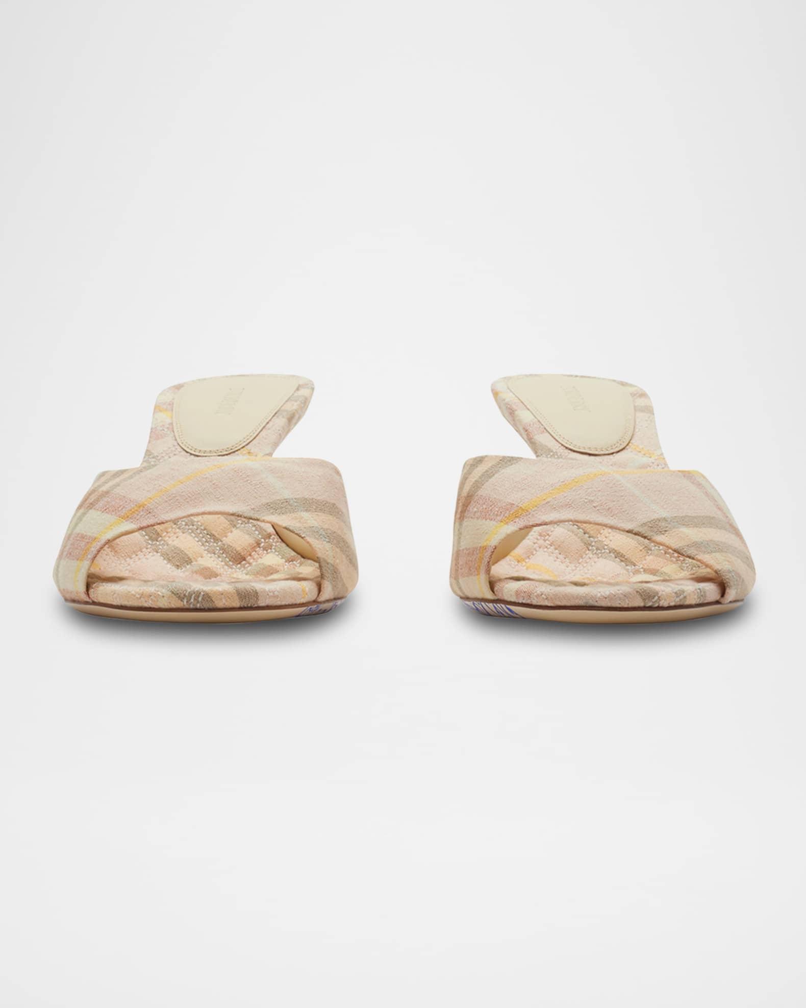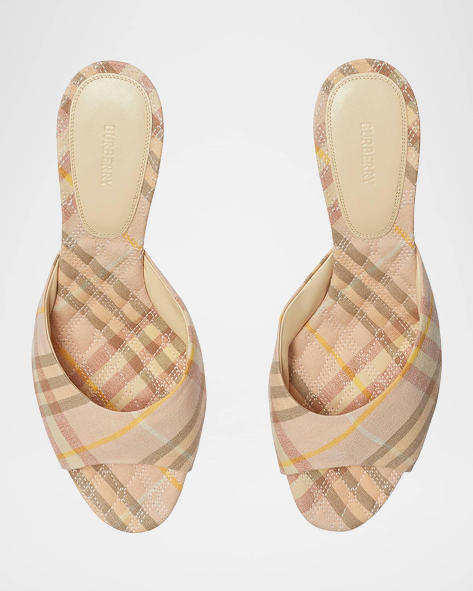 Burberry "Mews" mules in a linen fabric 2.50 in / 65 mm stiletto heel Open toe Leather/linen/elastane lining Quilted footbed Leather outsole Easy slide style Made in Italy