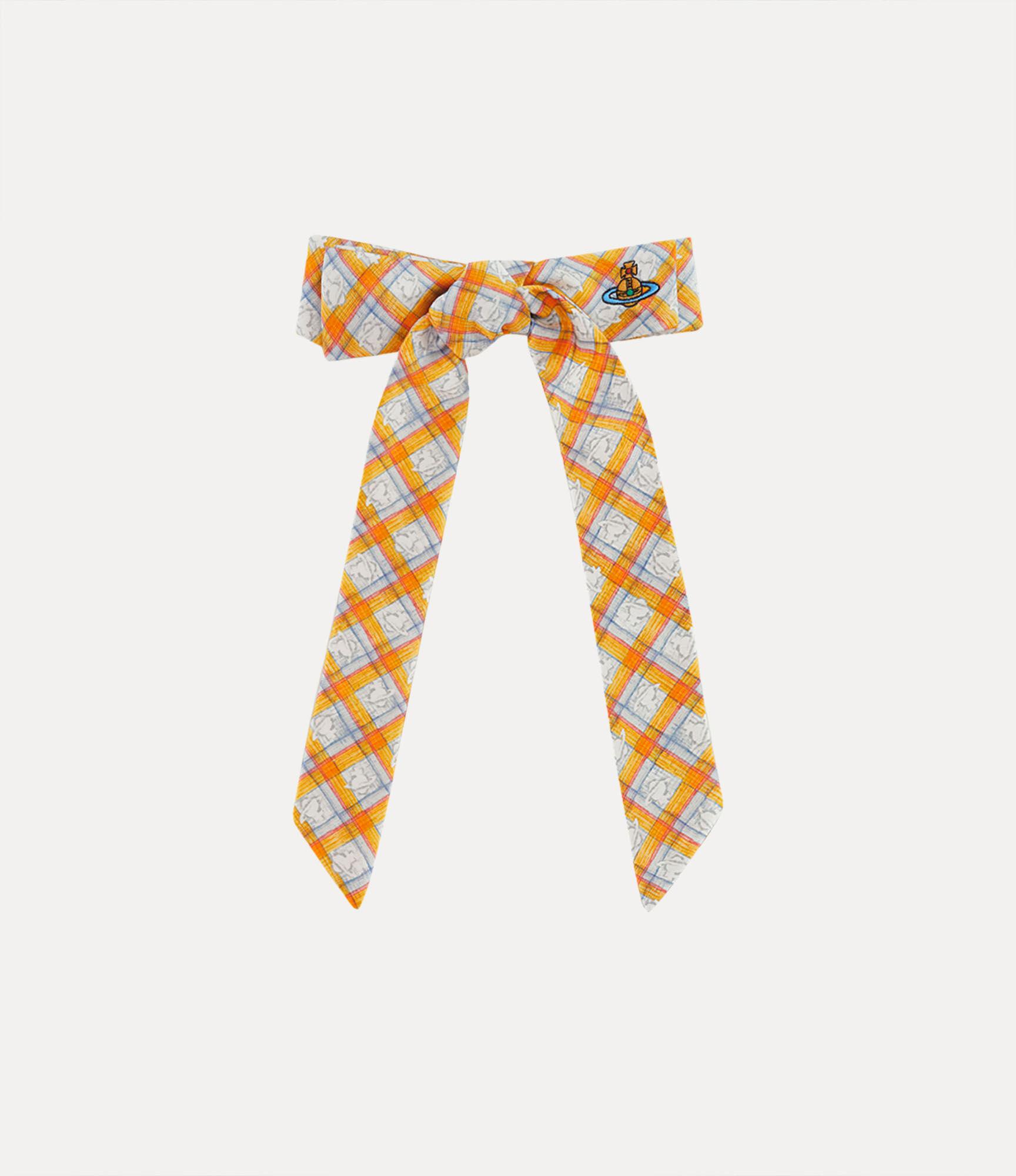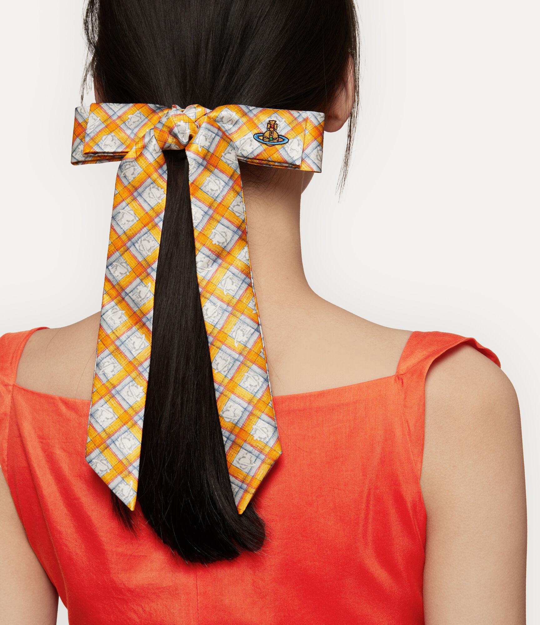 The Check Orb hair cis characterised by its oversized bow-shaped silhouette, decorated with the 'check orb' artwork across the design, featuring the newly introduced elevated orb motif in the jacquard fabric. The layered bow design adopts a playful check pattern, evoking a nostalgic charm that defines our new collection, hand-finished with a multi-coloured orb embroidery.