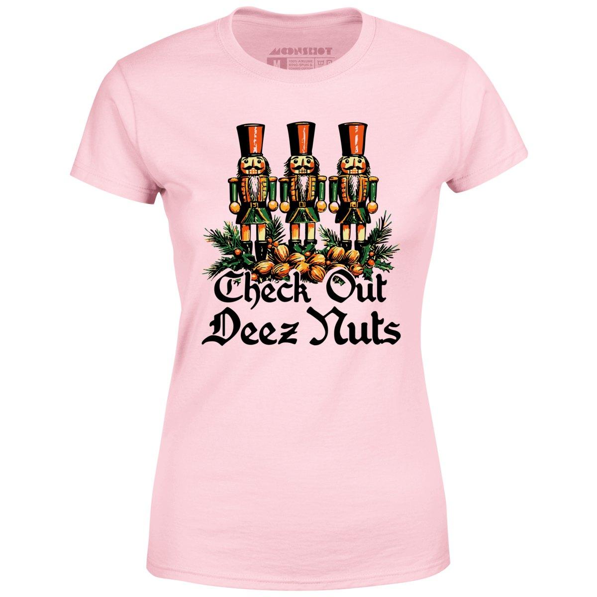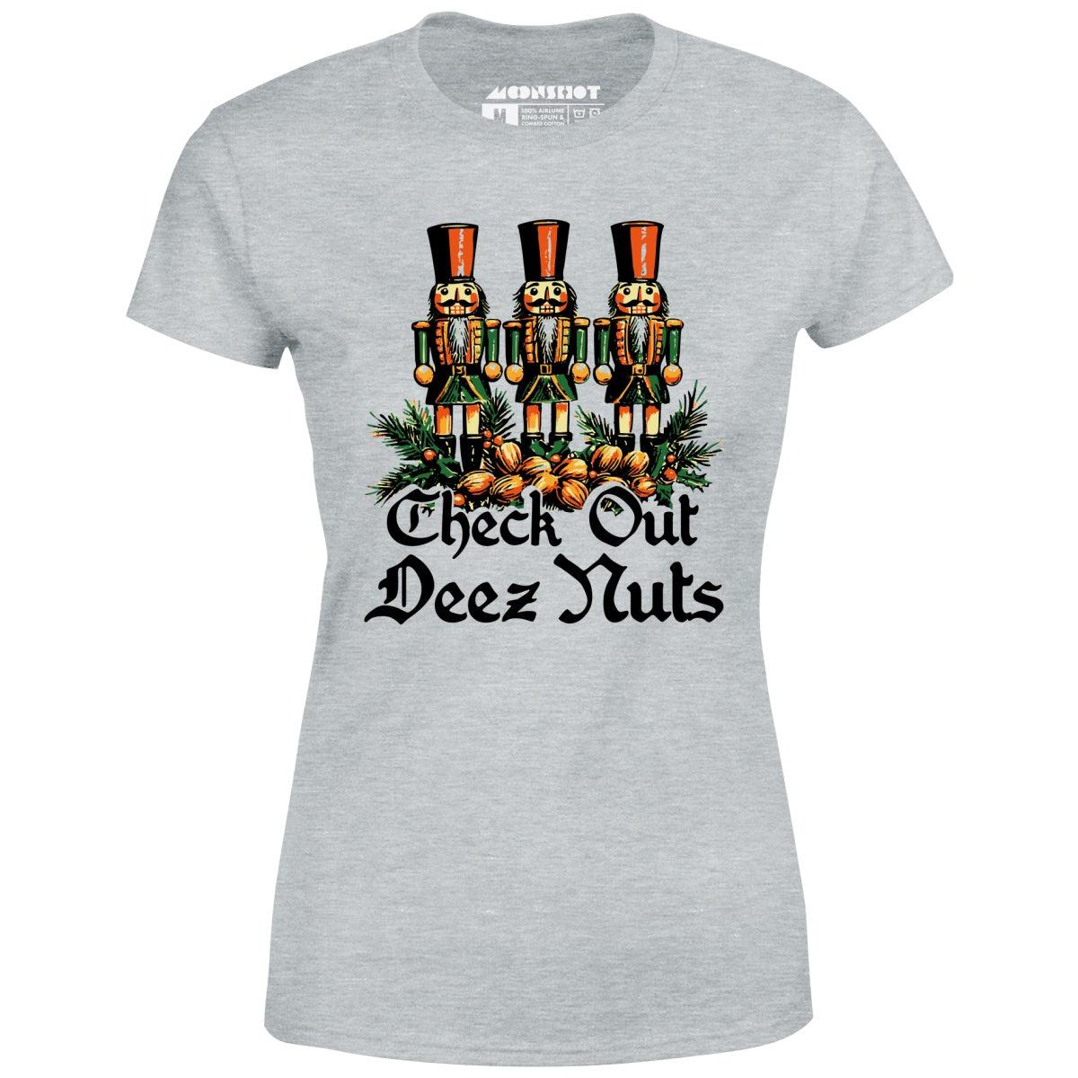 Get ready to bring the holiday laughs with our "Check Out Deez Nuts" design, featuring a trio of nutcrackers and a nod to everyone's favorite punchline. Perfect for holiday parties or gift-giving to that friend who appreciates a funny adult humor joke, this shirt adds a hilarious twist to your festive wardrobe. Whether you're decking the halls or just spreading some cheer, let everyone know you’ve got the guts to celebrate the season with style and a sense of humor that’s anything but nutty! Printed on our super soft 100% ringspun & combed cotton women's T-Shirt. Or upgrade to our Luxury 52/48 cotton/poly vintage heather edition for an even softer classic look. We print & ship all of our high quality graphic tees in the USA.
