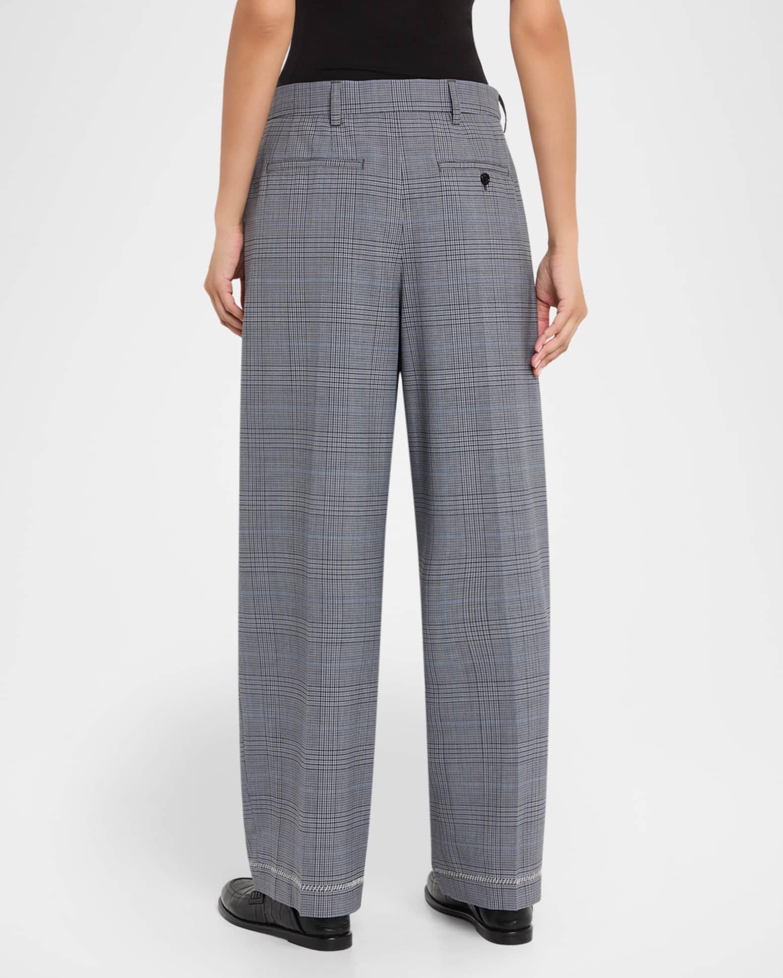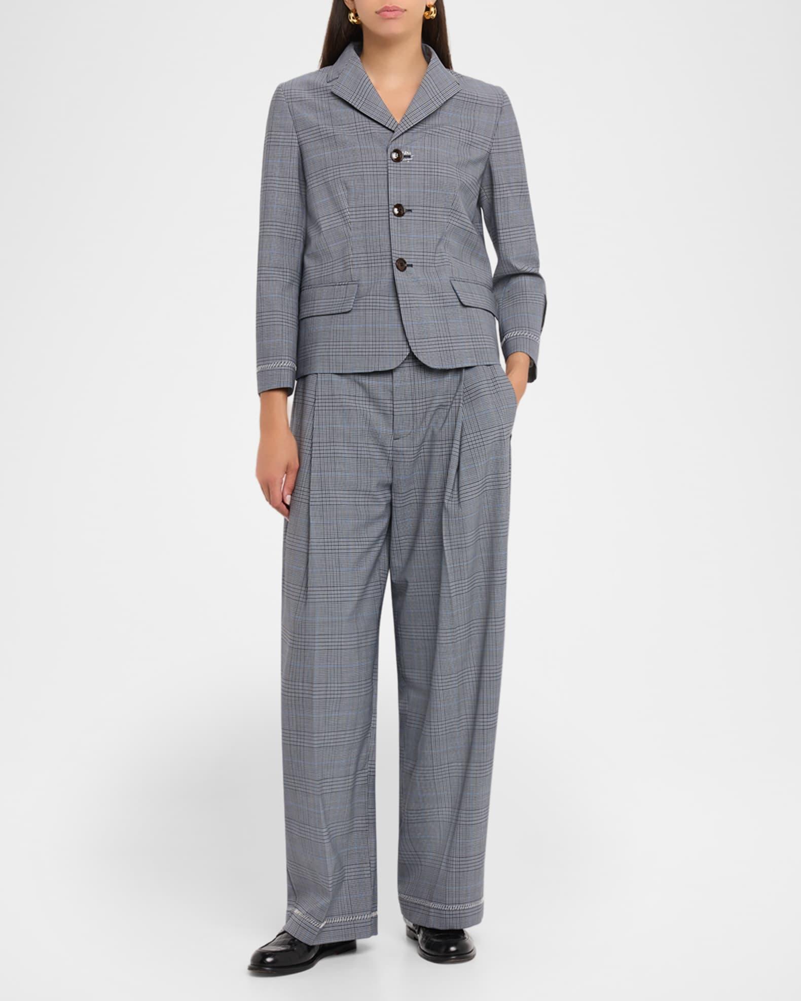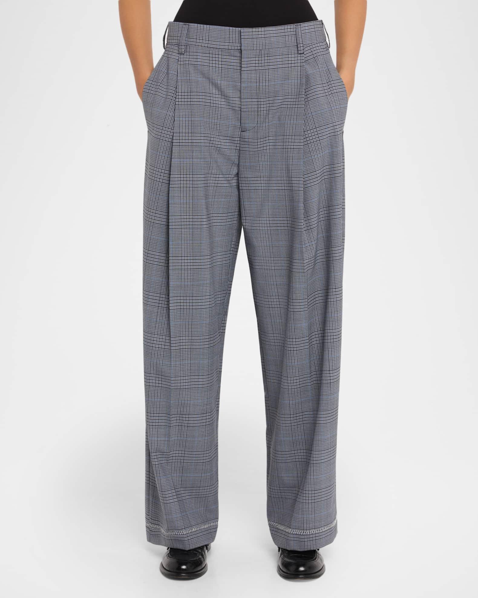 Marni trousers featuring a check motif and topstitched hem detail Mid rise sits high on hip Single pleated front Side slip pockets Back welt pockets with button Wide legs Full length Hook/zip fly; belt loops Polyester/virgin wool/elastane Lining: Cupro/silk Made in Italy
