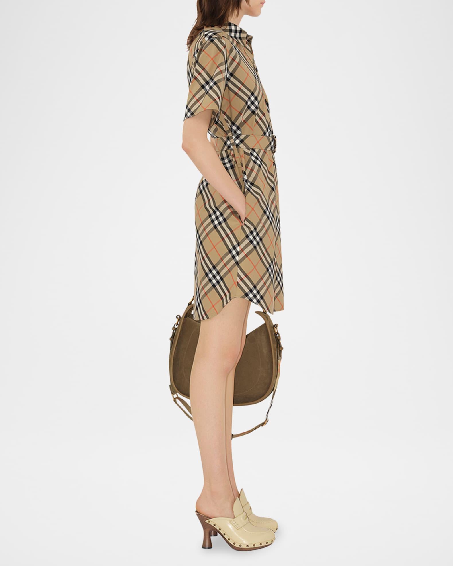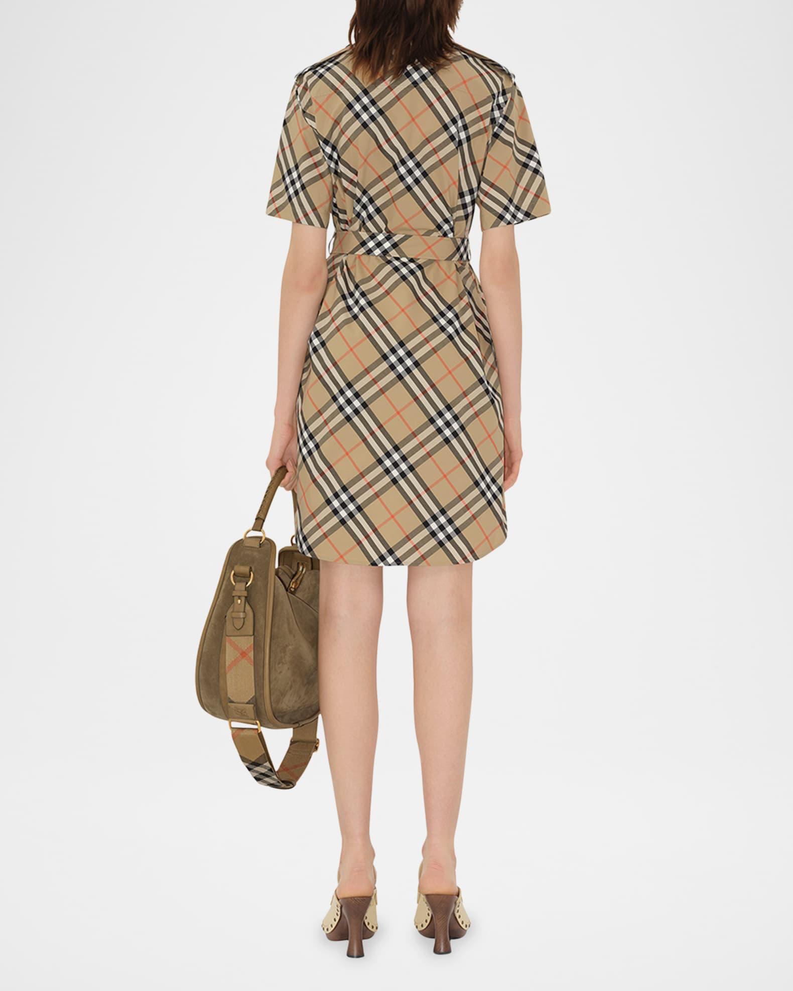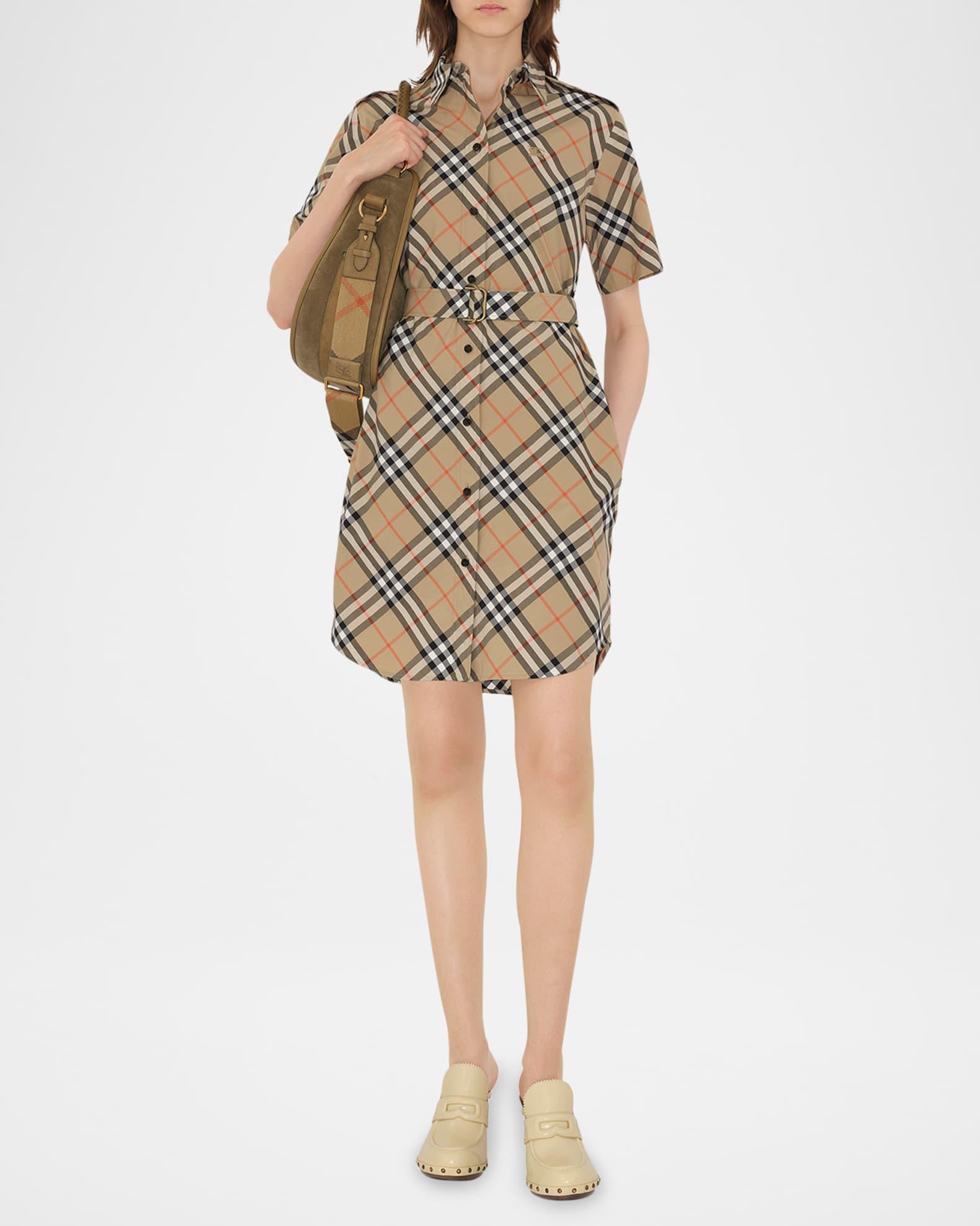 Burberry dress featuring a signature check motif, EKD embroidered chest, and a self-belt Point collar; concealed button front Short sleeves Belted waist Side split pockets Sheath silhouette Mid-thigh length Shirttail hem Cotton Lining: Cotton/viscose Made in United Kingdom