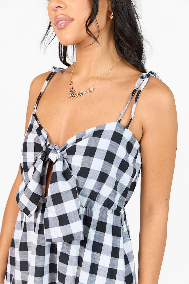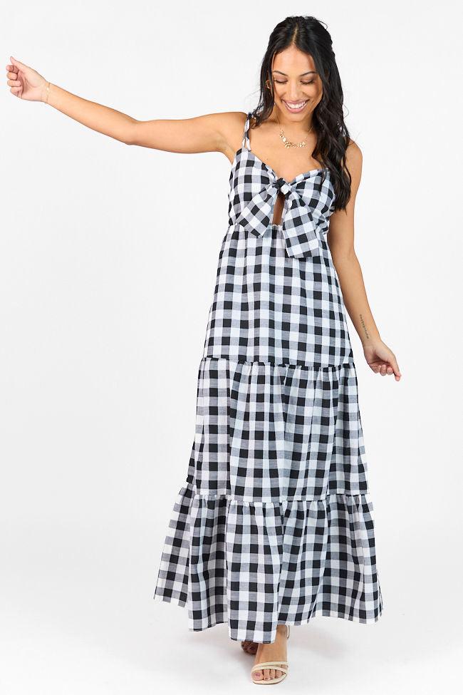 Details Gingham Tie Front Maxi Dress Black/White Fabric has no stretch Adjustable tie straps, tie front detail, elastic waist Lined Size small from shoulder to hem: 48" Material and Care 50% cotton 50% polyester, Lining: 95% polyester 5% elastane Machine wash cold, hang dry Patterns may vary Materials may have natural variations Colors may vary from different viewing devices.