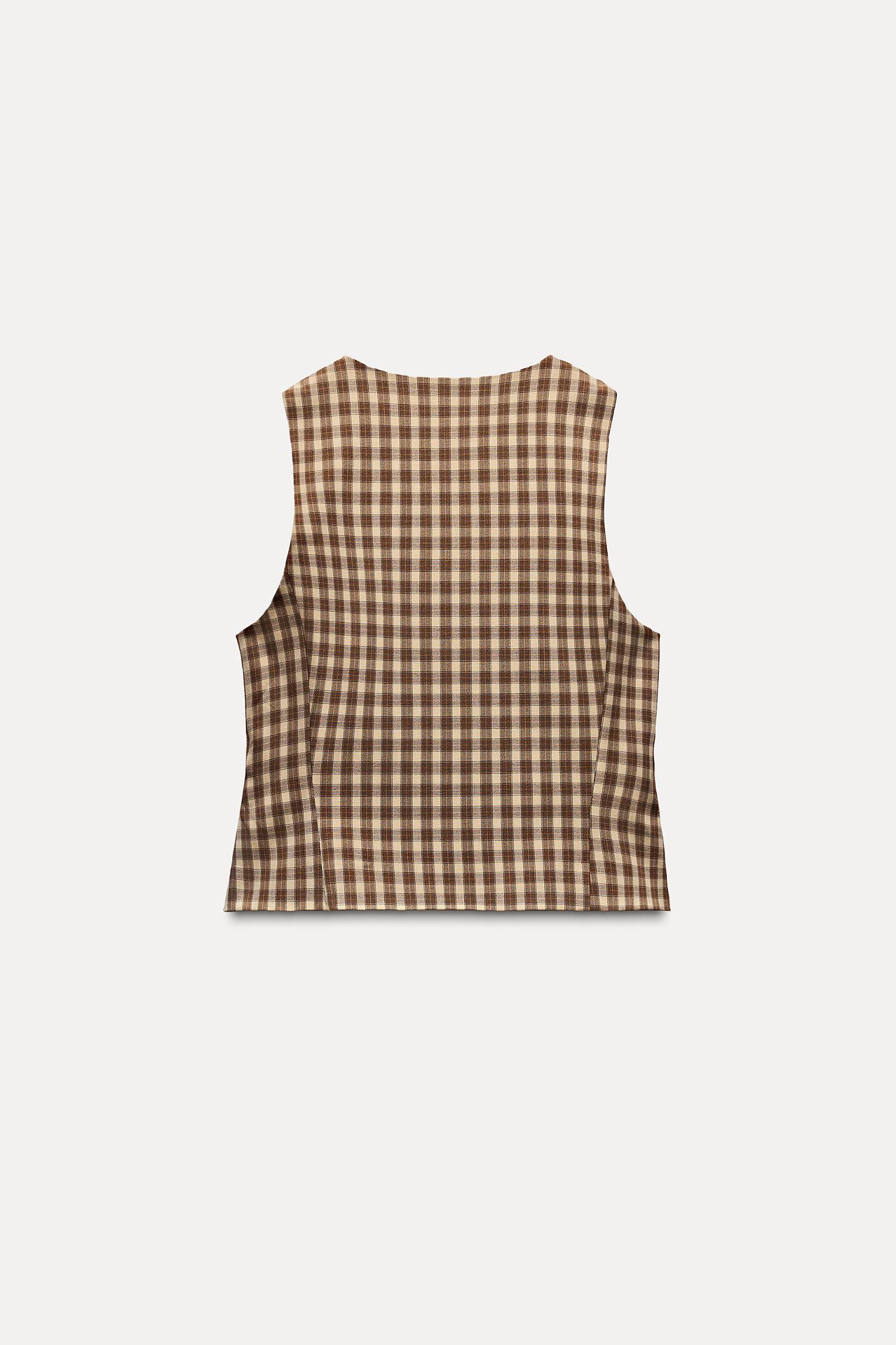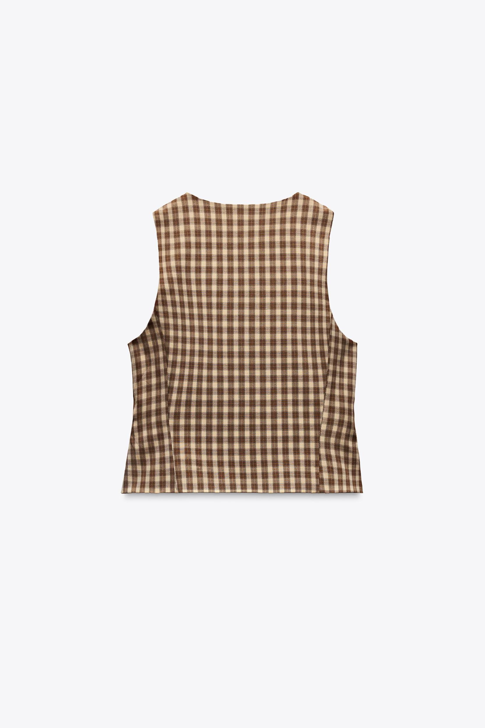 Fitted sleeveless vest top with round neckline. Flap pockets at front. Interior lining. Front closure with self lined buttons.