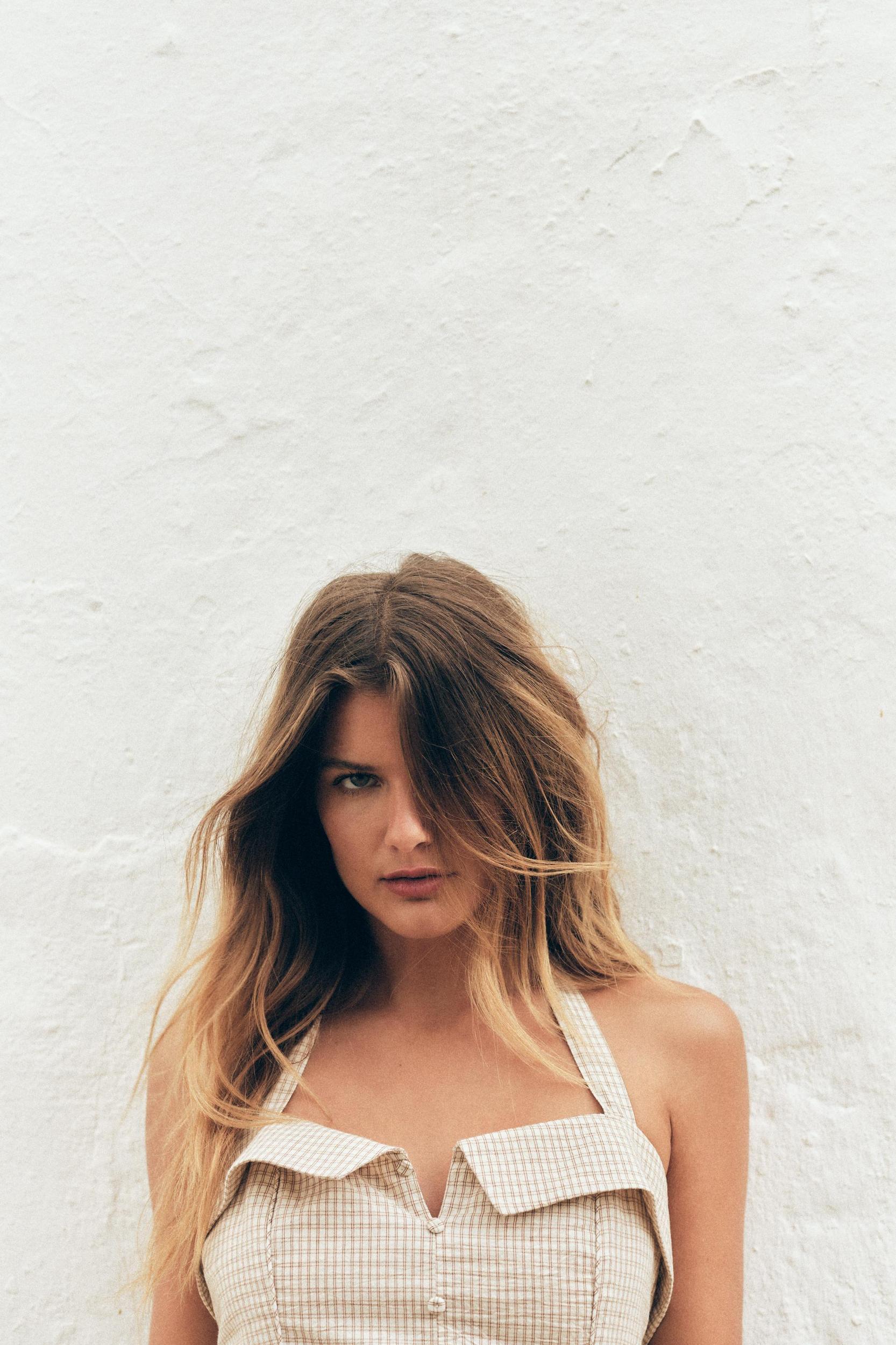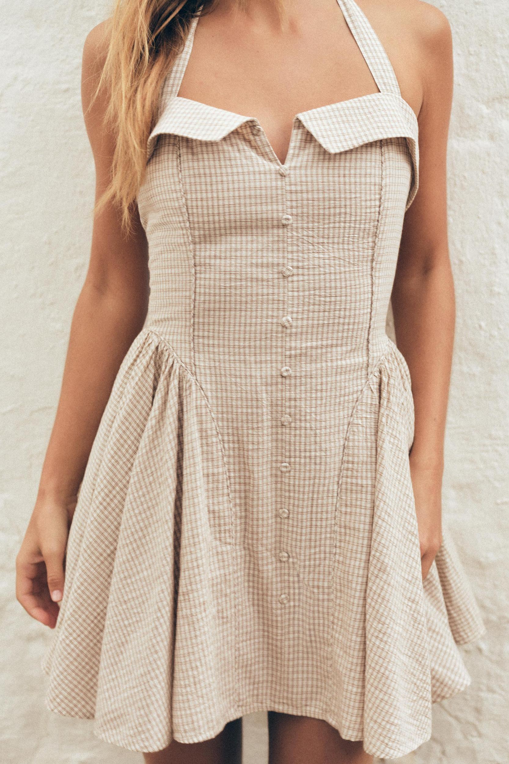 Short halter neck dress with a straight neckline and slit. Hidden in-seam side pockets. Honeycomb textured stretch fabric at back. Covered button detail at front. Matching lining.