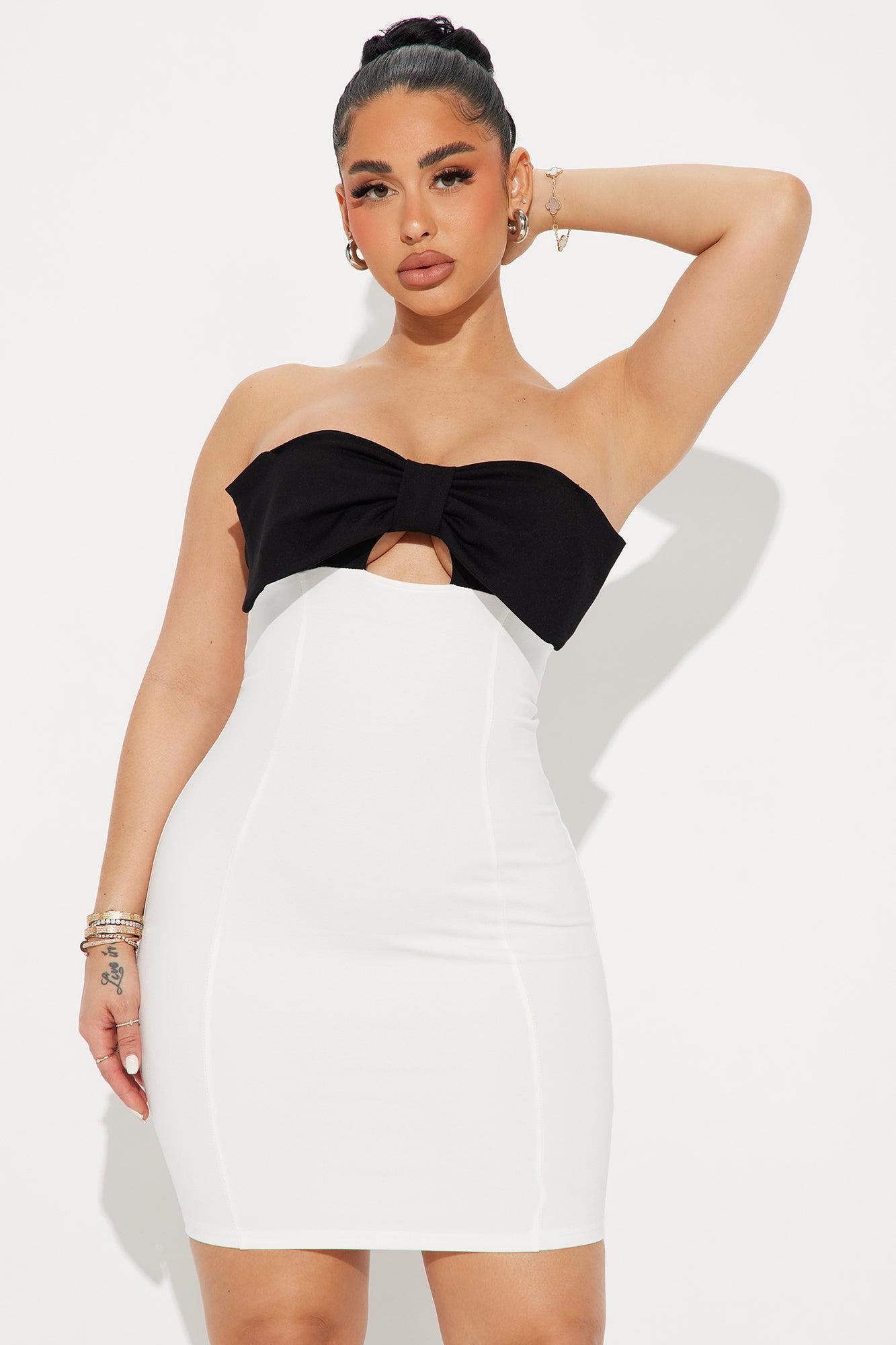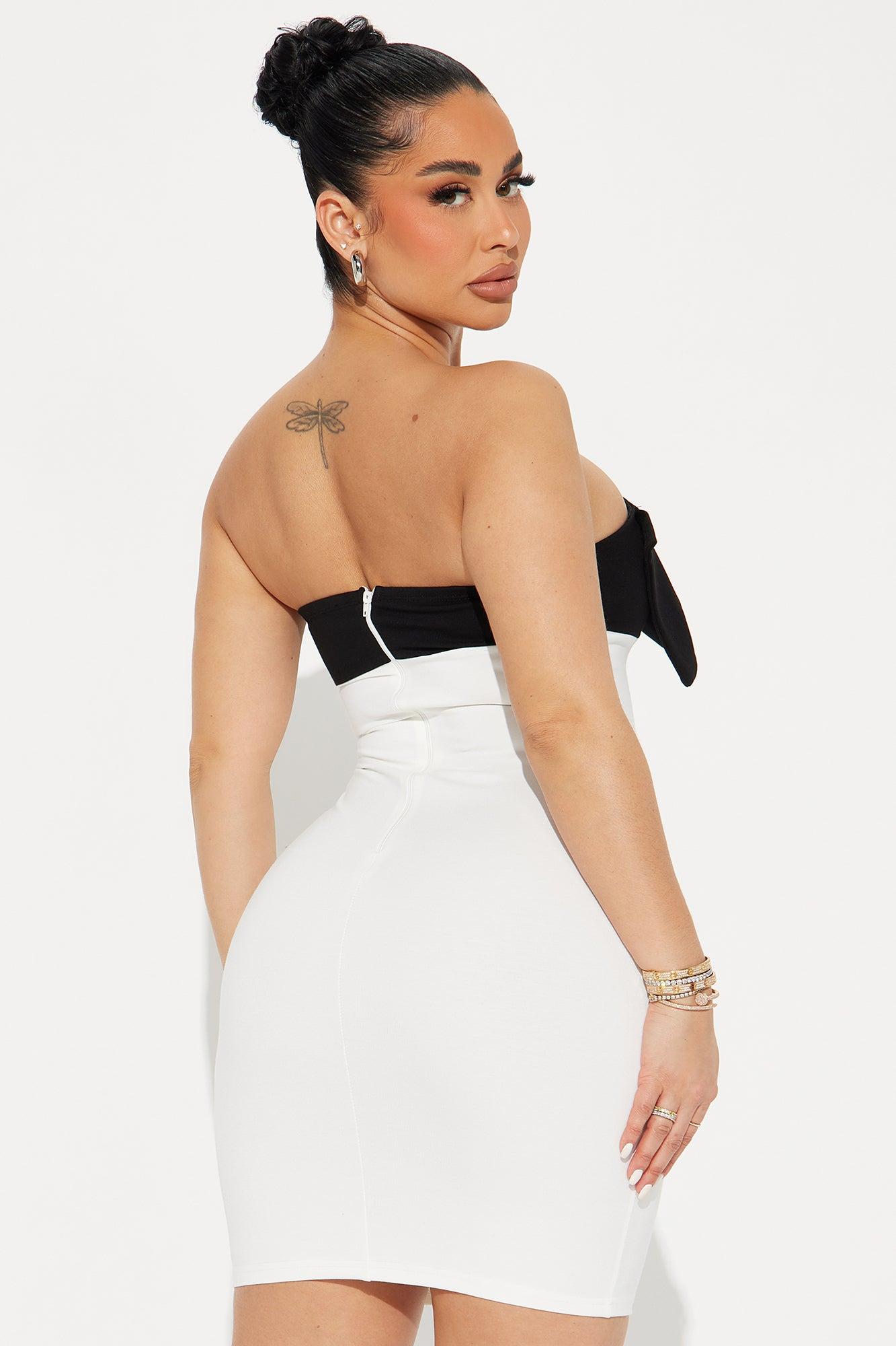 Available In Black/White. Mini Dress Sweetheart Neck Strapless Oversized Bow Detail Cut Out Back Zipper Stretch Length = 33" 63% Rayon 32% Nylon 5% Spandex Imported California Proposition 65 WARNING: Cancer and Reproductive Harm - www.P65Warnings.ca.gov.