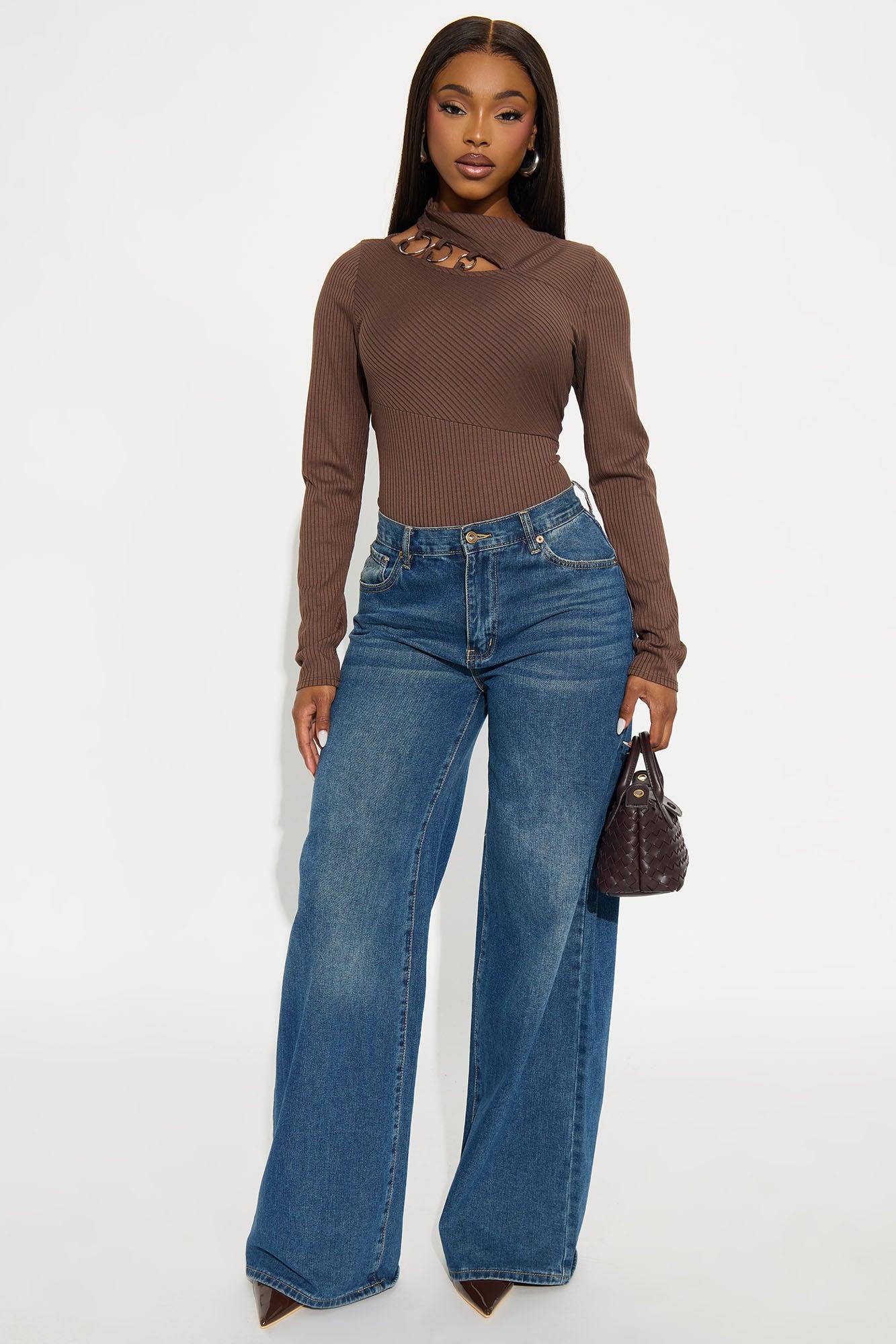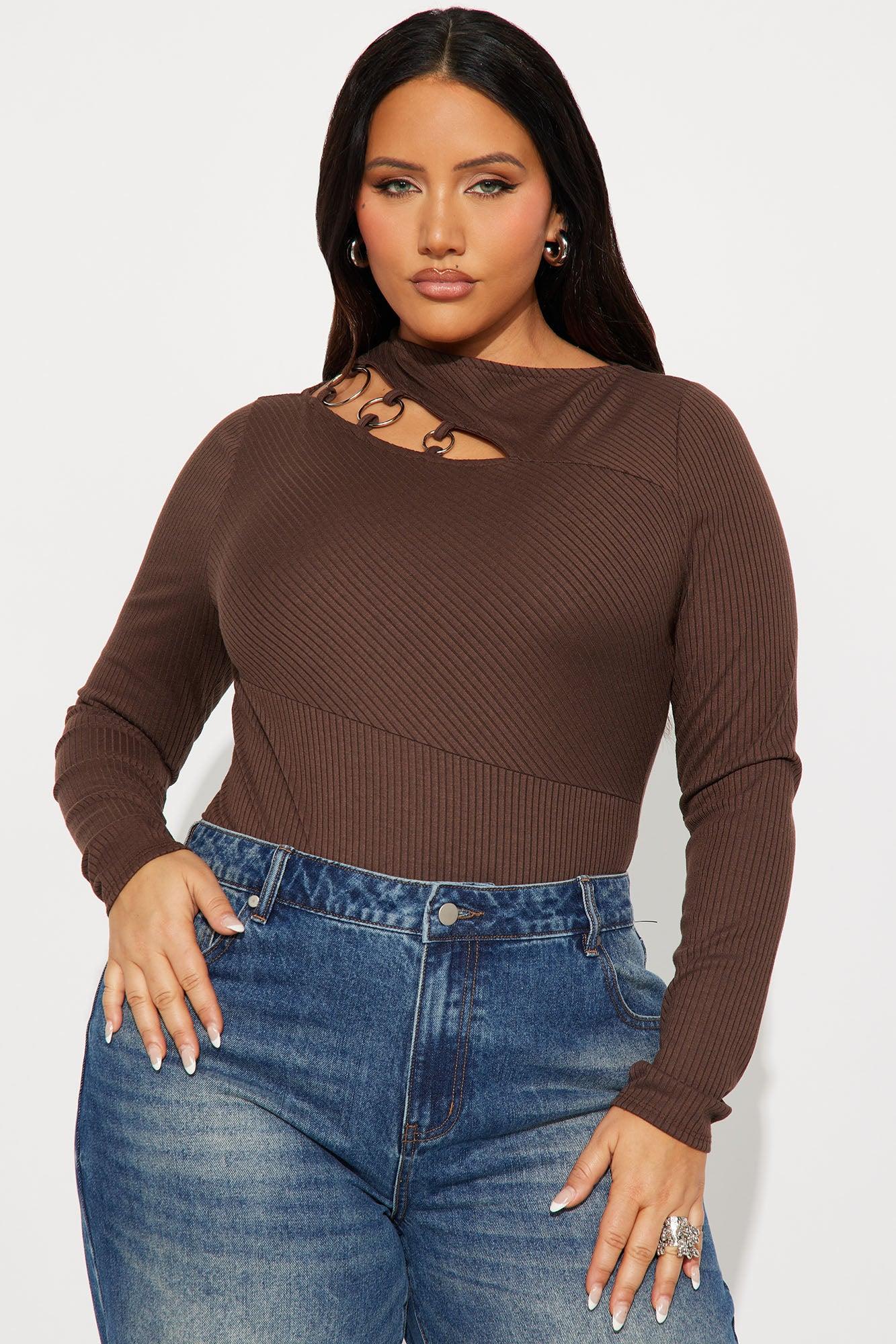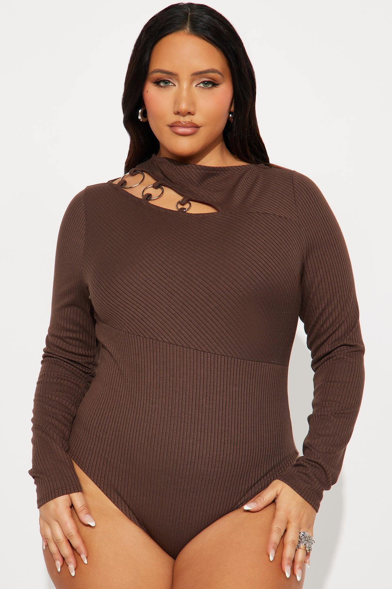 Available In Brown And Olive. Ribbed Bodysuit High Neck Long Sleeve Cut Out Hardware Thong Bottom Snap Button Closure Stretch Final Sale Self 83% Polyester 10% Rayon 7% Spandex Imported California Proposition 65WARNING: Cancer and Reproductive Harm - www.P65Warnings.ca.gov.