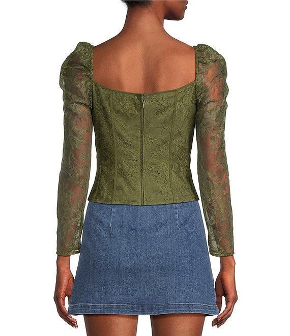From Chelsea & Violet, this blouse features: Woven lace fabrication Sweetheart neckline Long sleeves Smocked set-in shoulder Front bow detail Cropped Fully lined Back zipper closure Polyester Professional dry cleaning only Imported