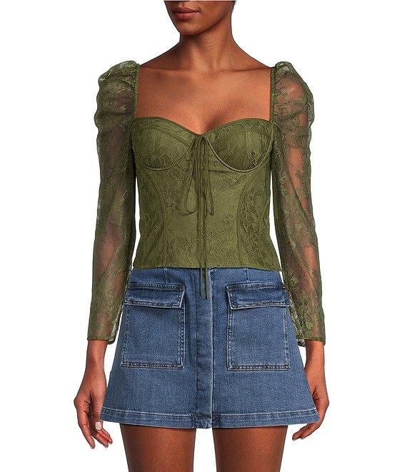 Chelsea & Violet Laura Woven Lace Sweetheart Neck Tie Front Long Sleeve Fitted Blouse