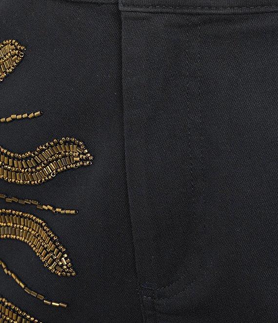 From Chelsea & Violet, these jeans feature: Denim fabrication High rise Straight leg Beaded appliqué detailing Zipper and shank center front 4 Pockets Approx. 27" length; 13" inseam; 18.75" leg opening Cotton/elastane Lining: cotton Dry clean Imported. Dillard's Exclusive.